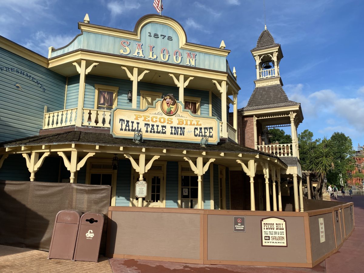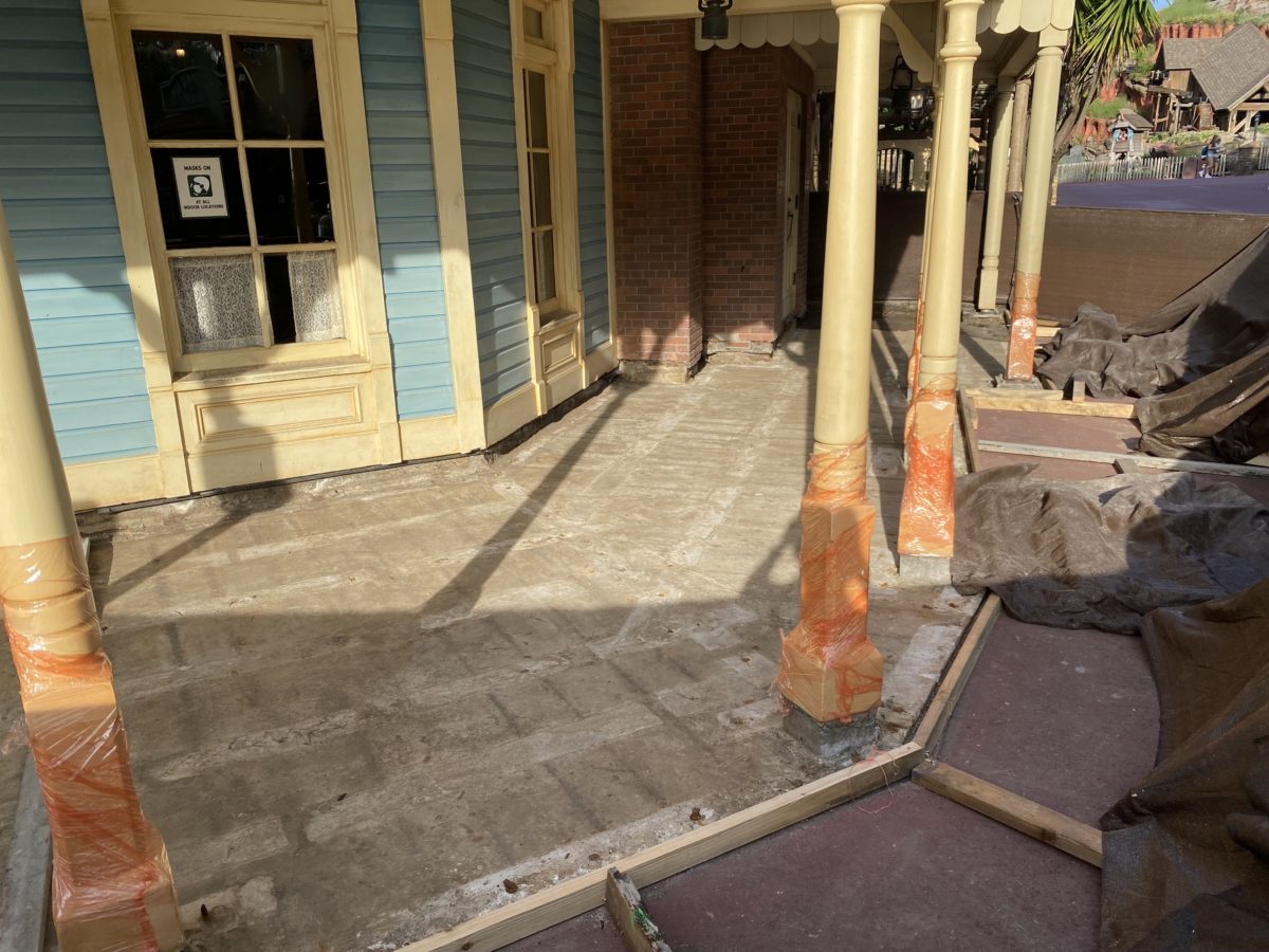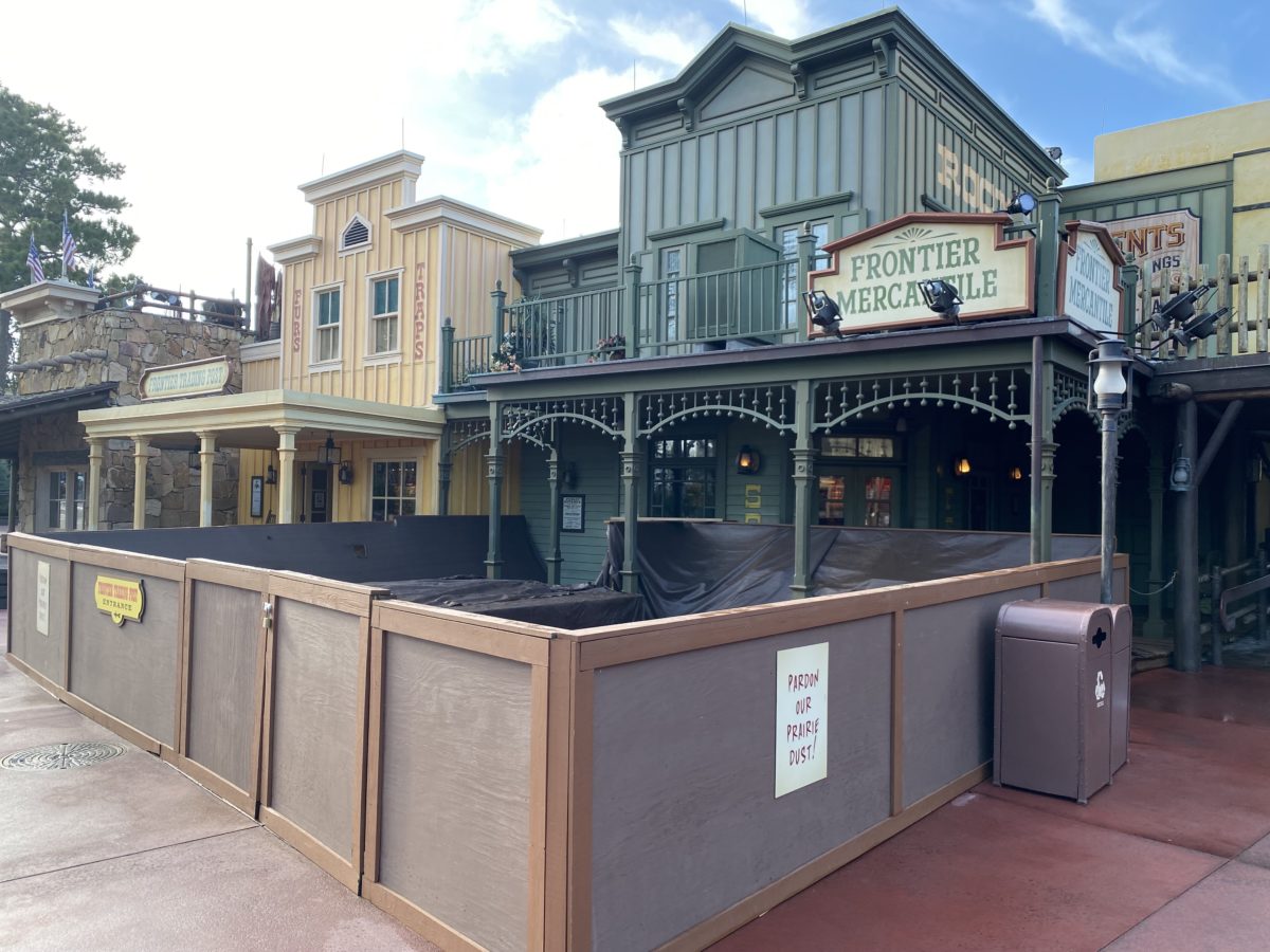 Frontierland construction continues as the boardwalk under Pecos Bill Tall Tale Inn & Cafe removes its old boards to make way for new ones.