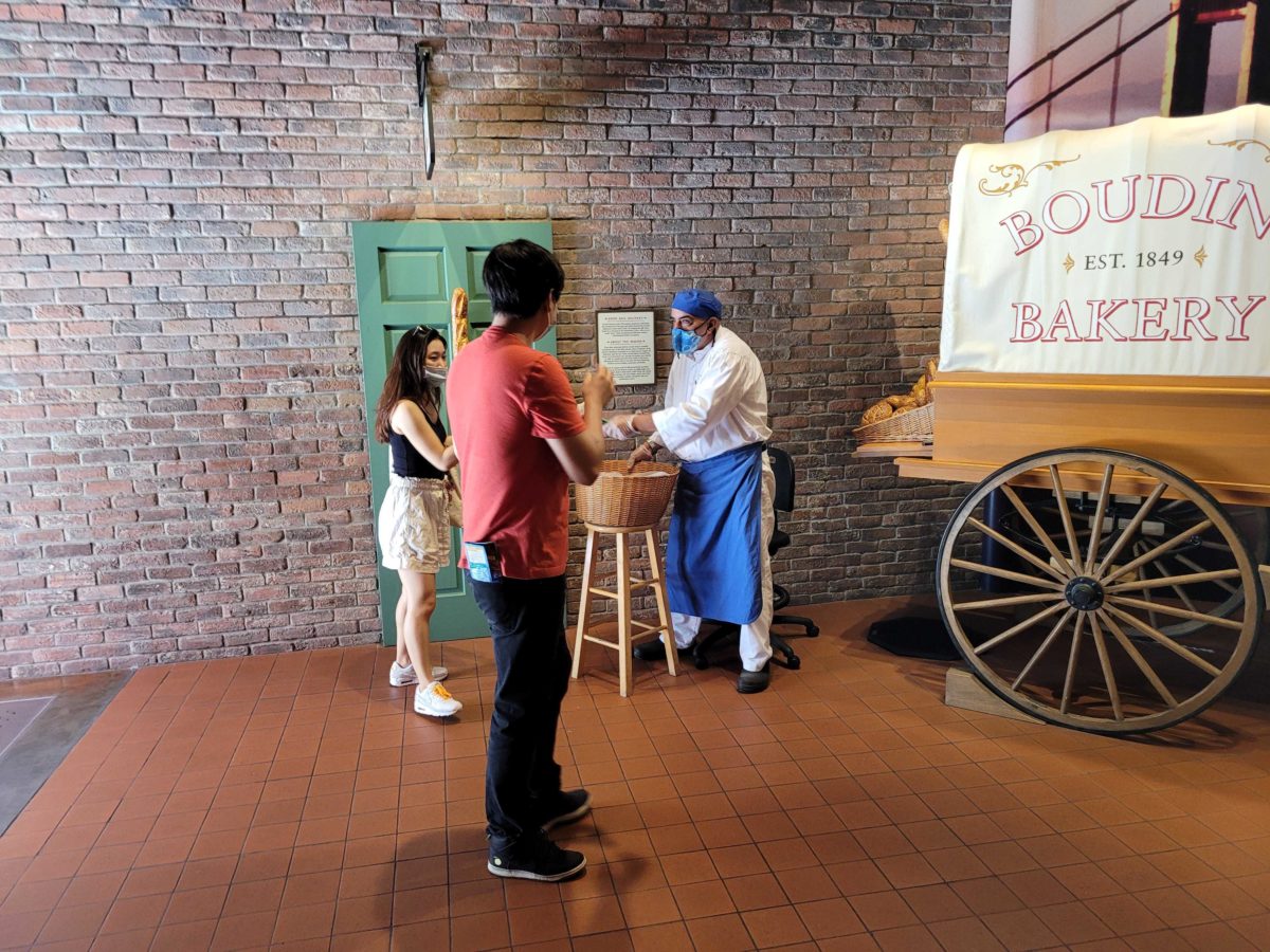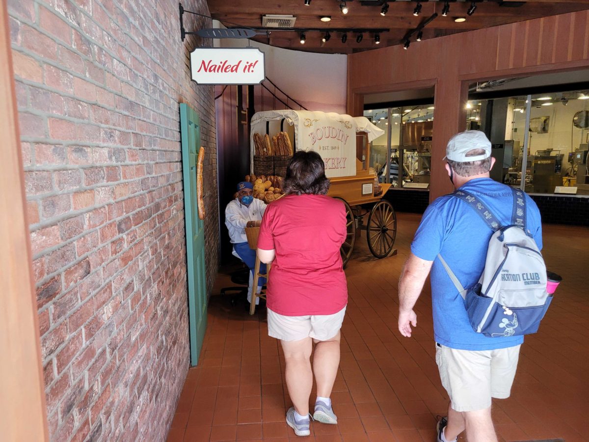 A Cast Member wearing gloves distributes the samples before guests take their video-guided tour of the bakery. While we weren’t specifically asked to, most of the guests we saw took their samples outside before eating them, keeping with the rule that all guests must wear face coverings while indoors.