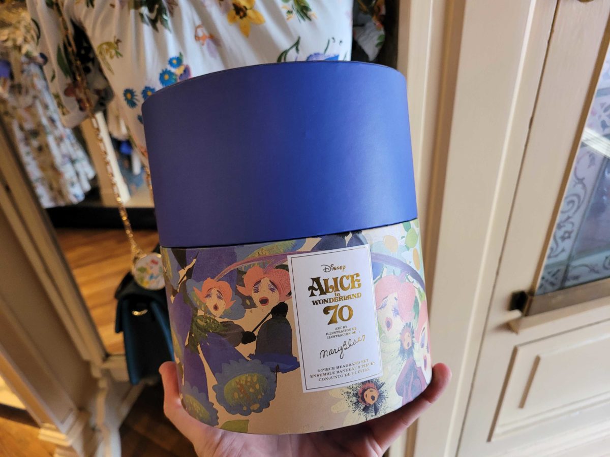 This cute hatbox comes with three Alice-inspired headbands.
