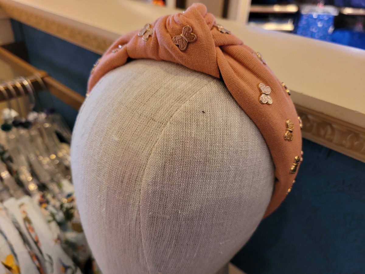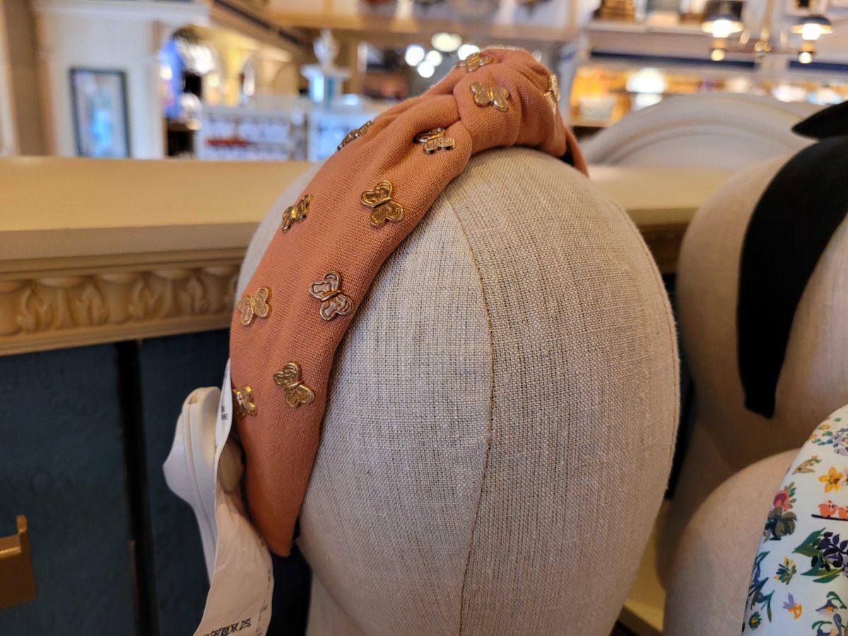 A pink headband has bronze “butter flies.”