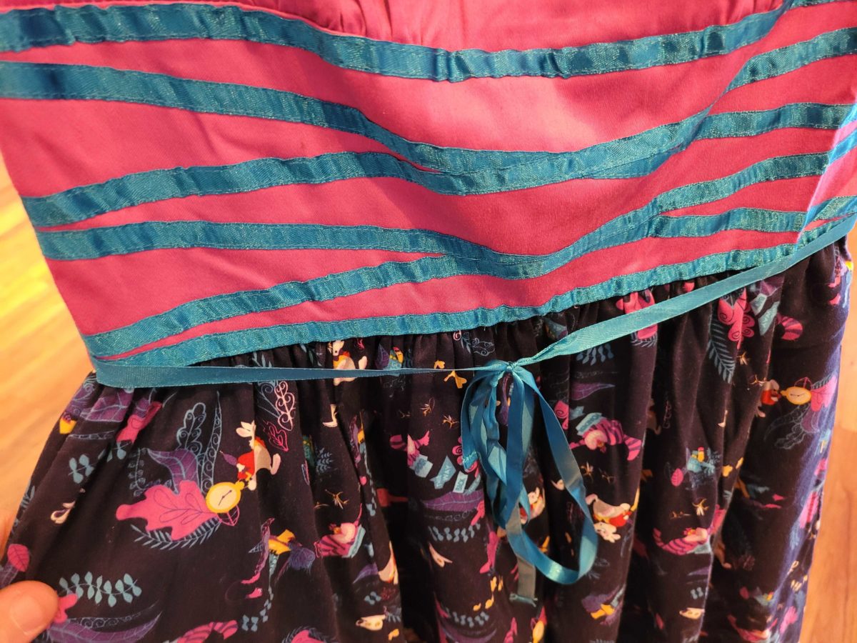 The top is pink with teal trim, and the skirt has an all-over Mary Blair print.