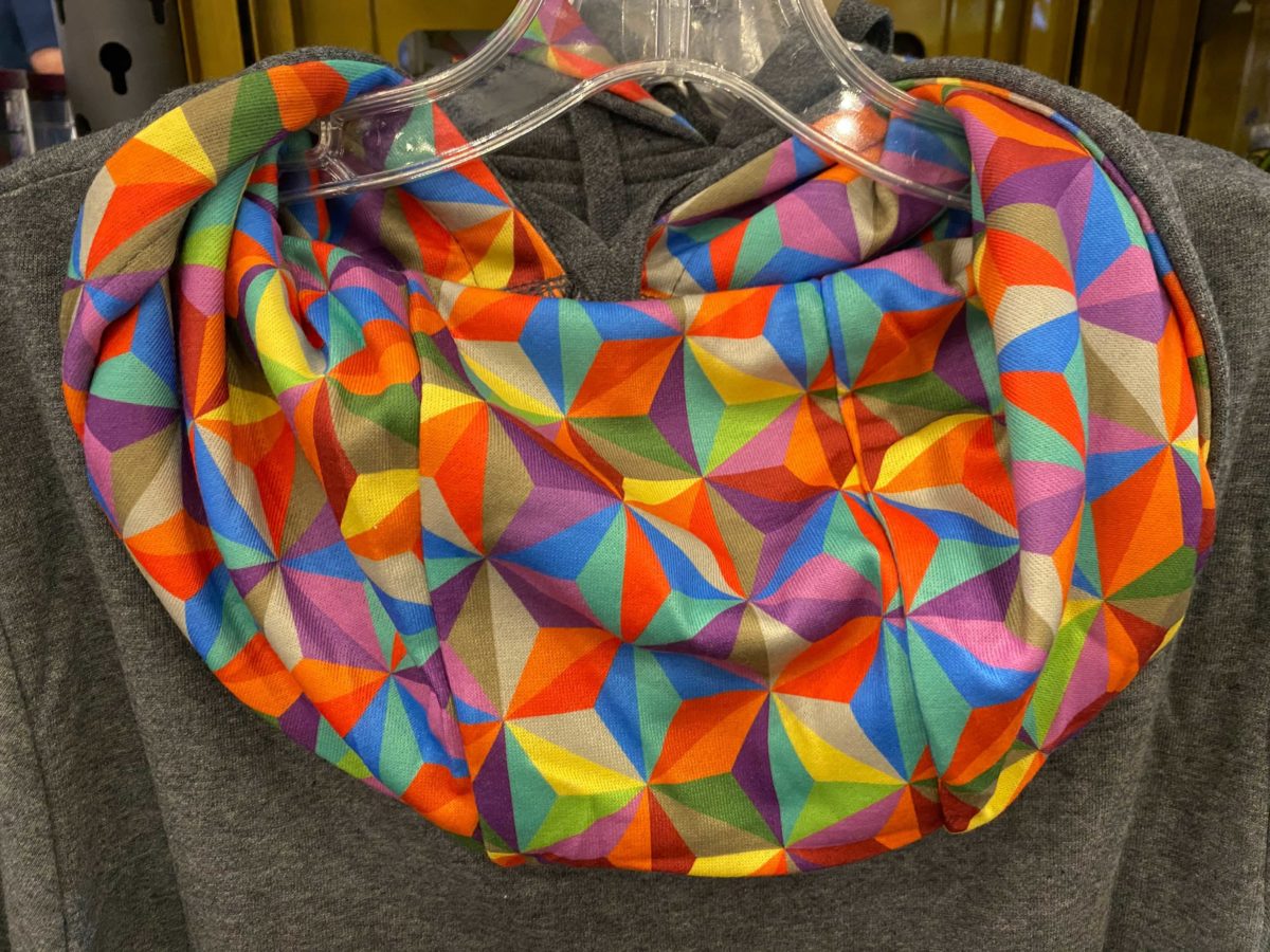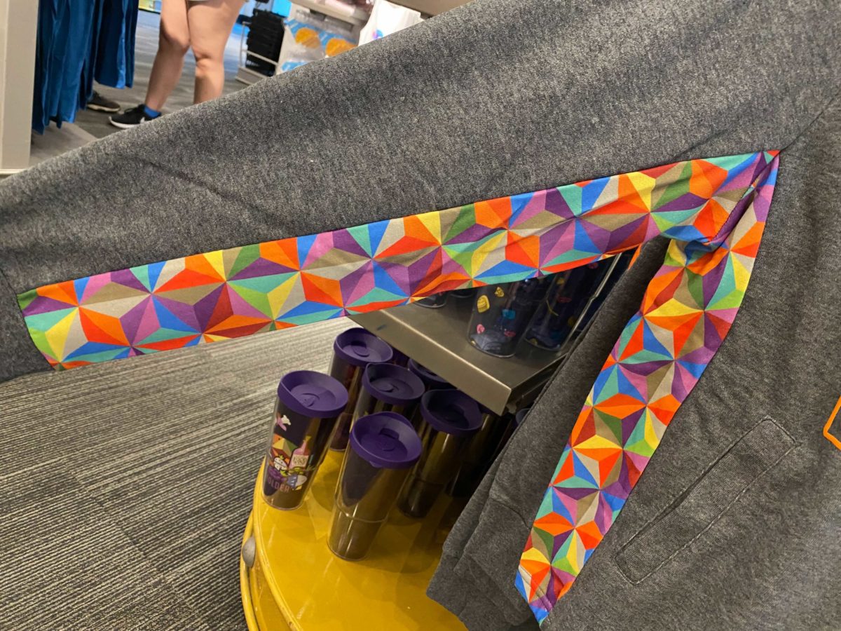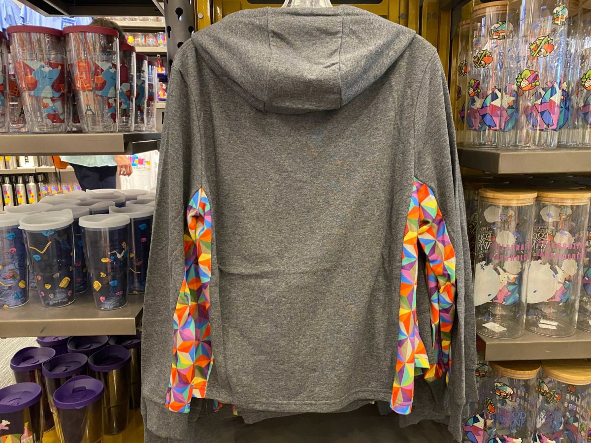 But perhaps the most exciting part of the hoodie is the rainbow Spaceship Earth tile-pattern seen on the sleeves and down the sides of the torso. EPCOT fans are sure to love this unique take on a piece of the park’s iconography.