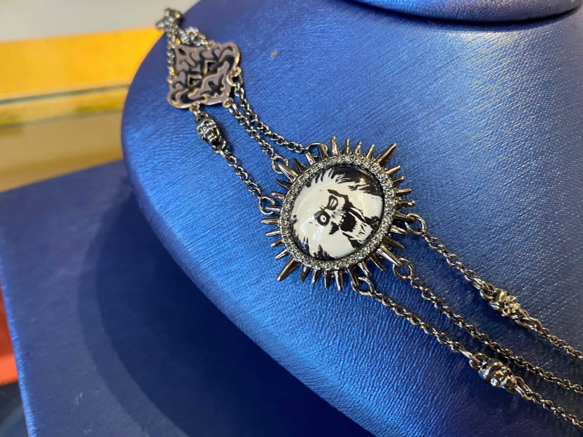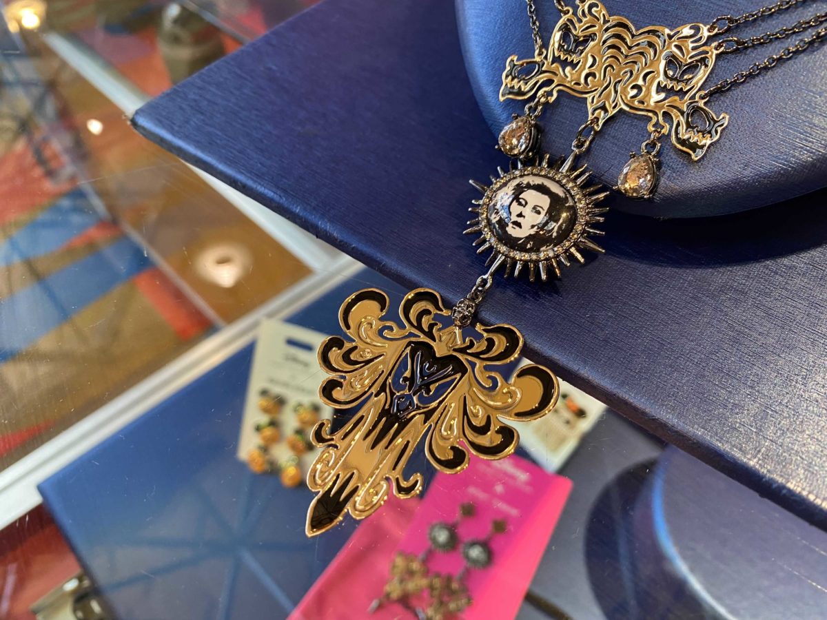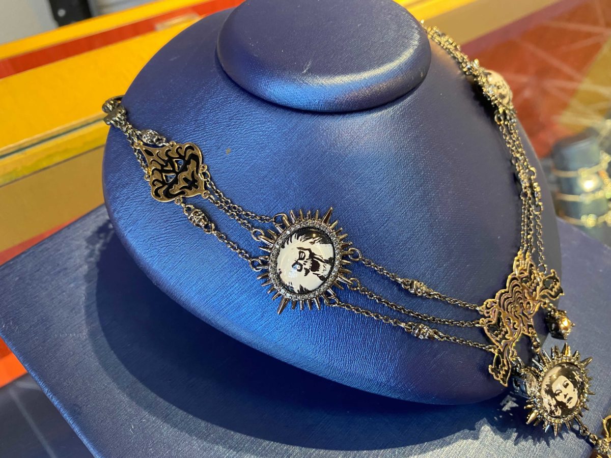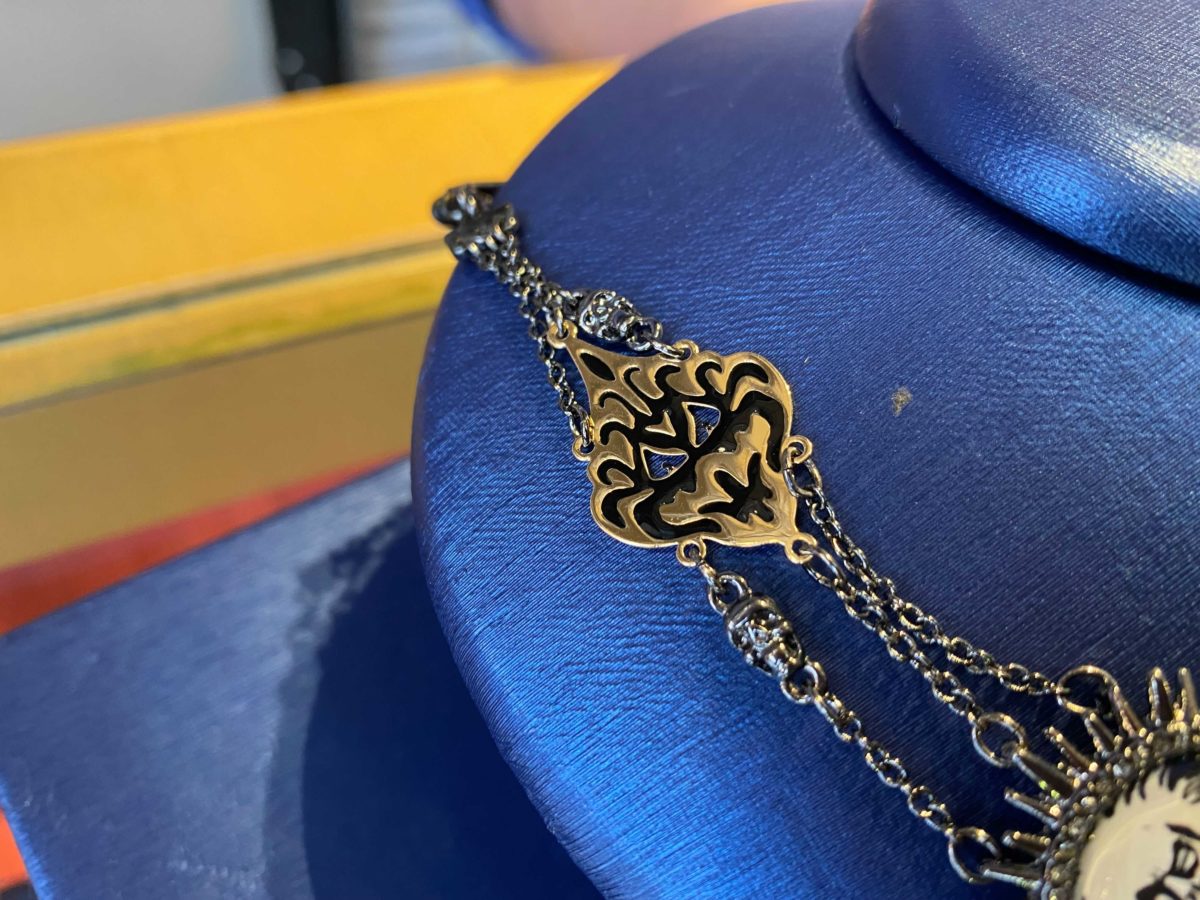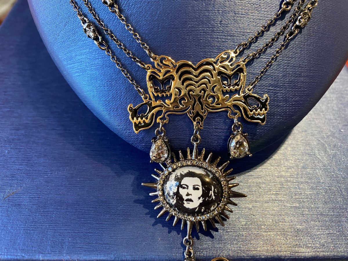 This costume necklace features Madame Leota and the Hatbox Ghost, as well as one of the endless hallway portraits.