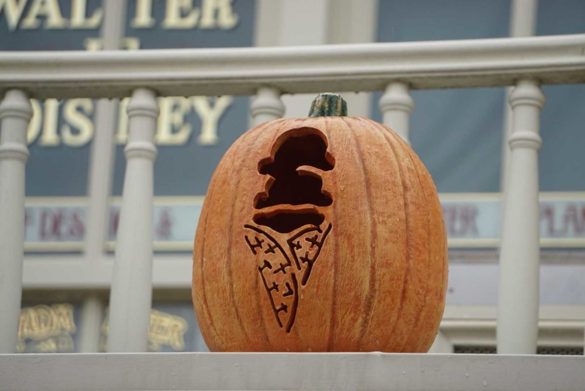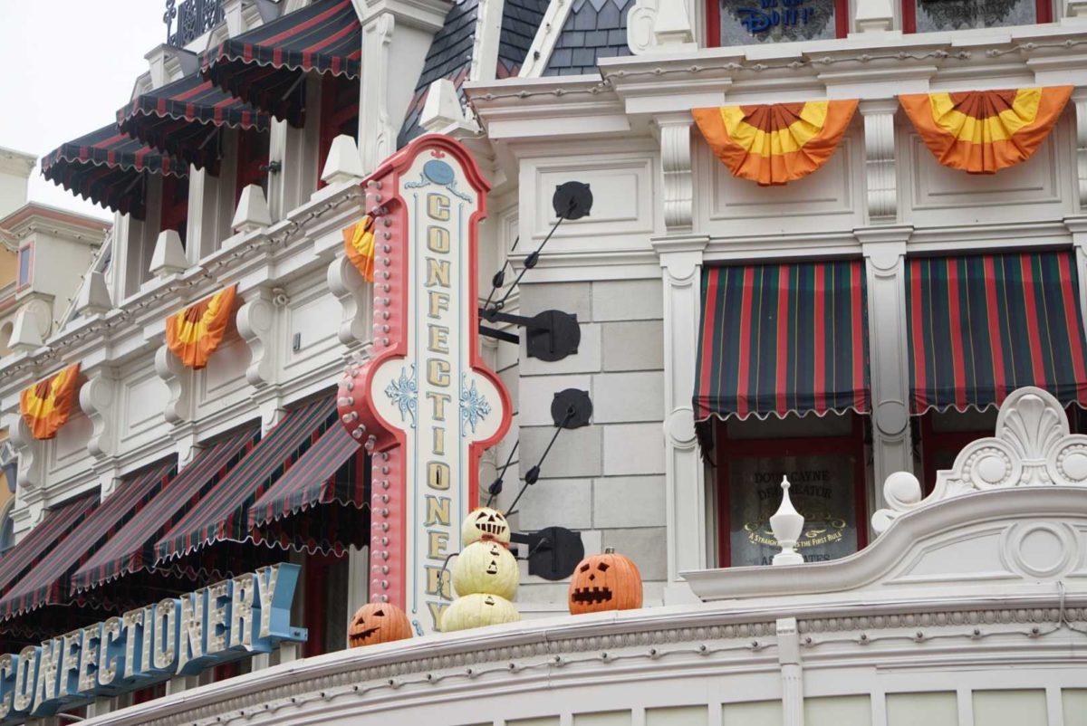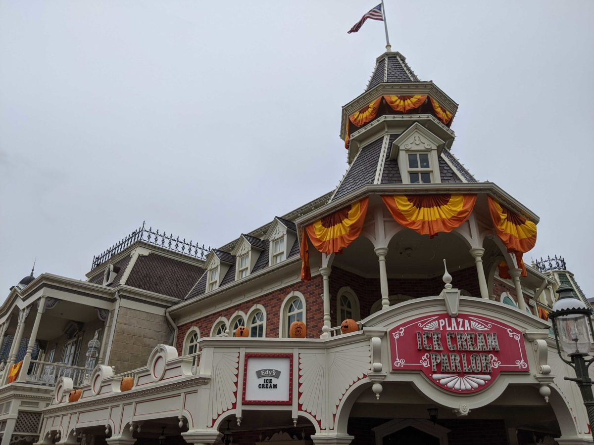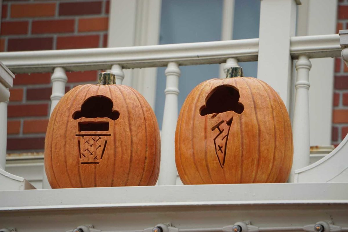 Each Main Street, U.S.A. shop and restaurant has its own themed pumpkins. The Plaza Ice Cream Parlor has pumpkins carved with ice cream cones.