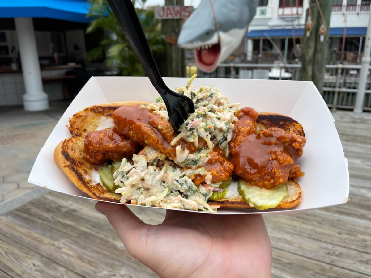 It’s not too overwhelming because the chicken is the only thing sauced. The plentiful serving of slaw and pickles helped cut the heat.