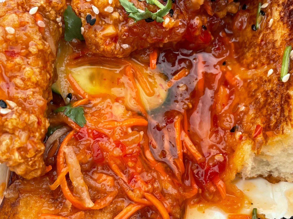 - 🆕 Banh-Mi: Hand breaded chicken tenders seasoned with Thai chili sauce topped with pickled vegetables, cilantro, cucumber, and sriracha aioli on a soft roll – $13.99