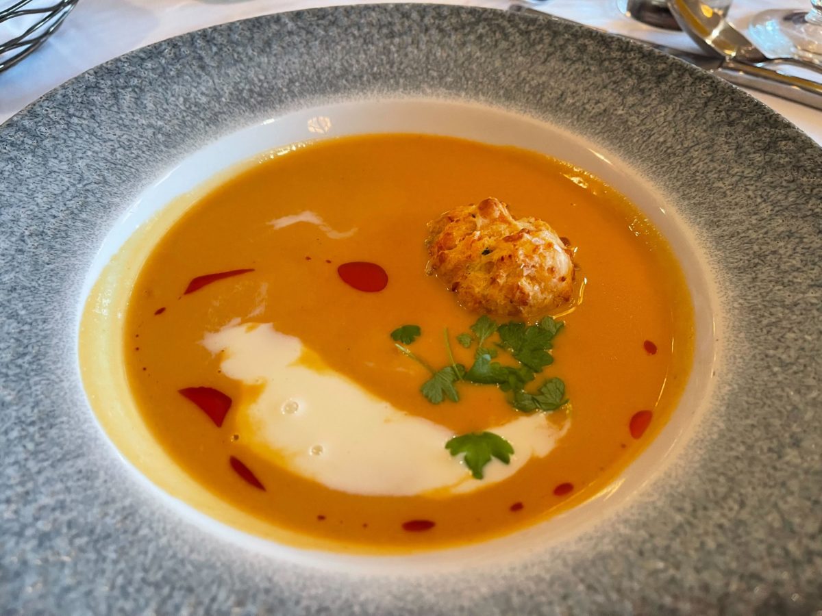 The lobster bisque is rich and creamy, with a strong lobster flavor. You could clearly taste the sherry as well. There is a sizable cheddar crouton with the texture of a cheddar biscuit from Red Lobster. This is their signature appetizer, and for good reason. If you like lobster bisque, this is phenomenal.