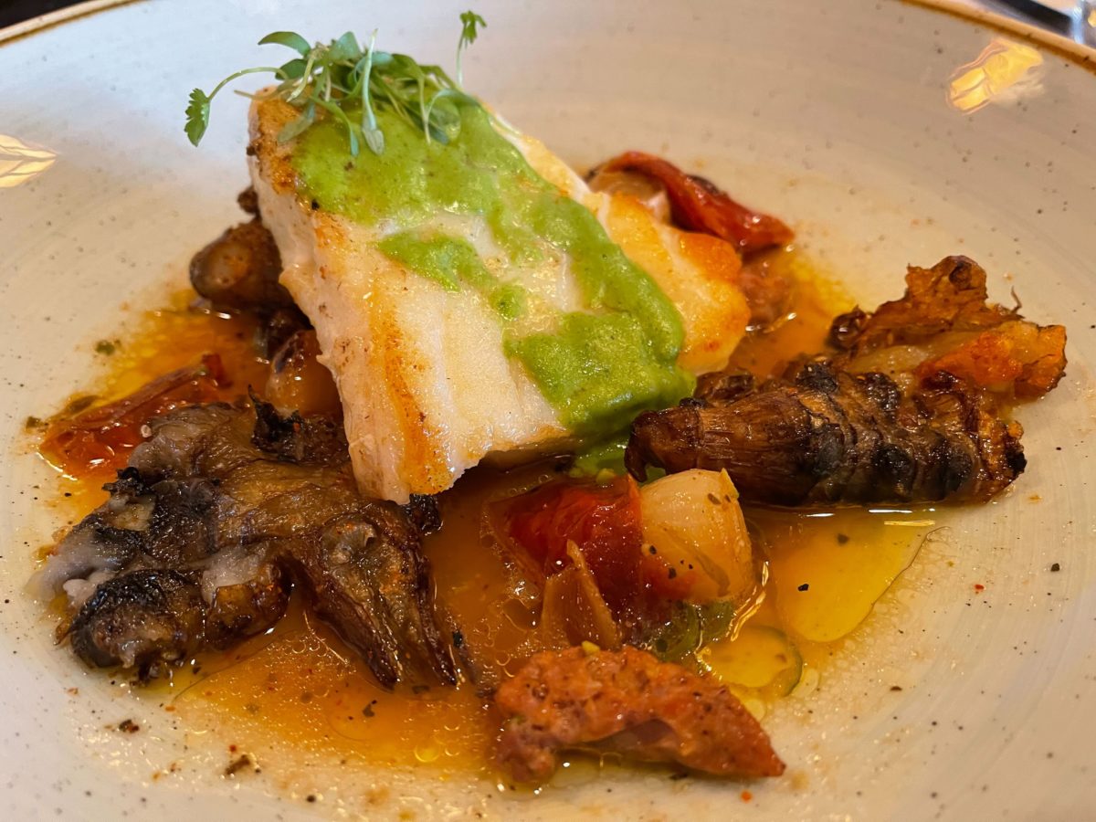 Charred Tomatillo Sauce, Sunchokes, Chorizo, Pearl Onions, and Cilantro Espuma
