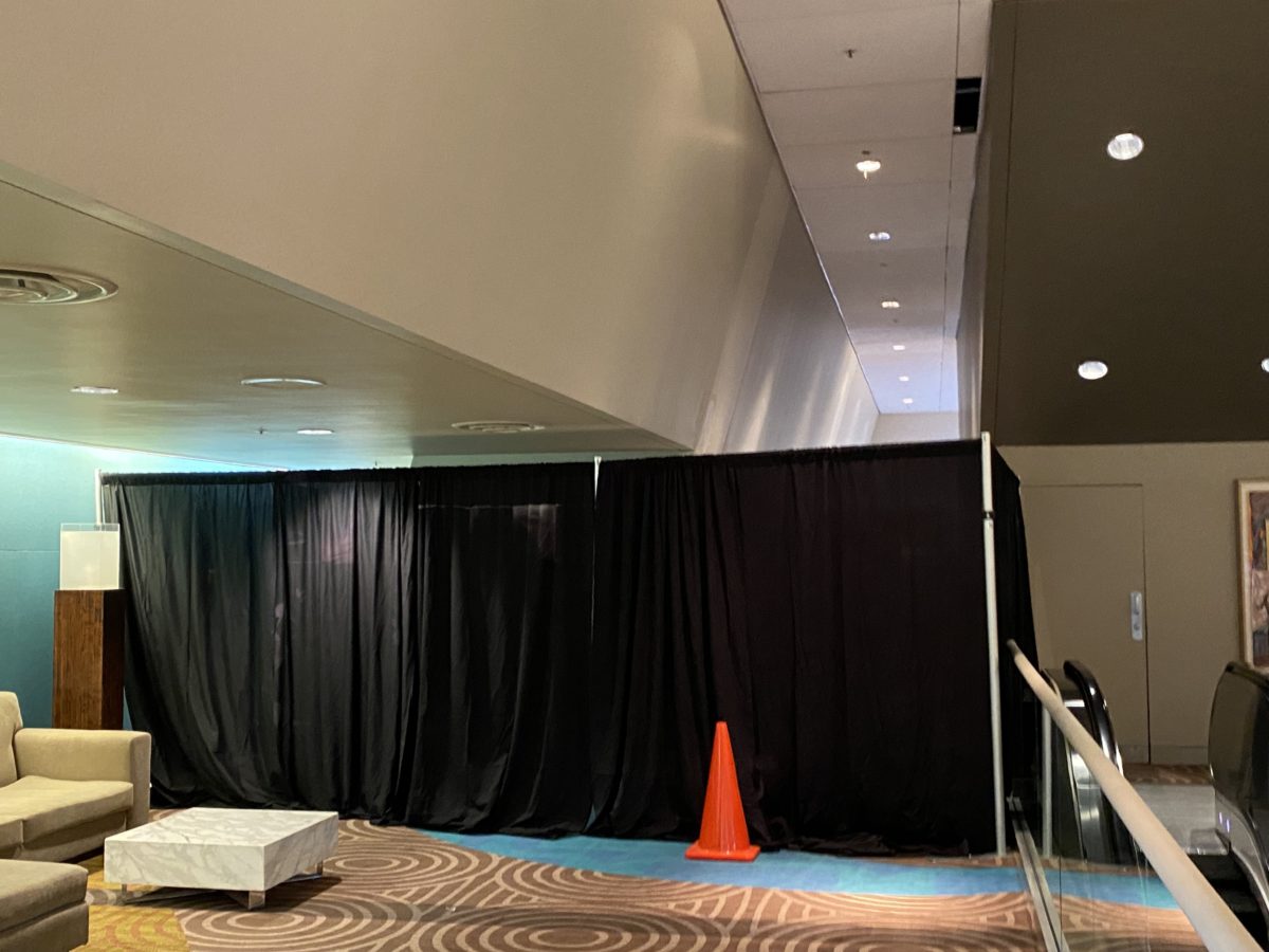 Over at Disney’s Contemporary Resort, the ceiling leak appears to be patched though the black curtain is still in place.