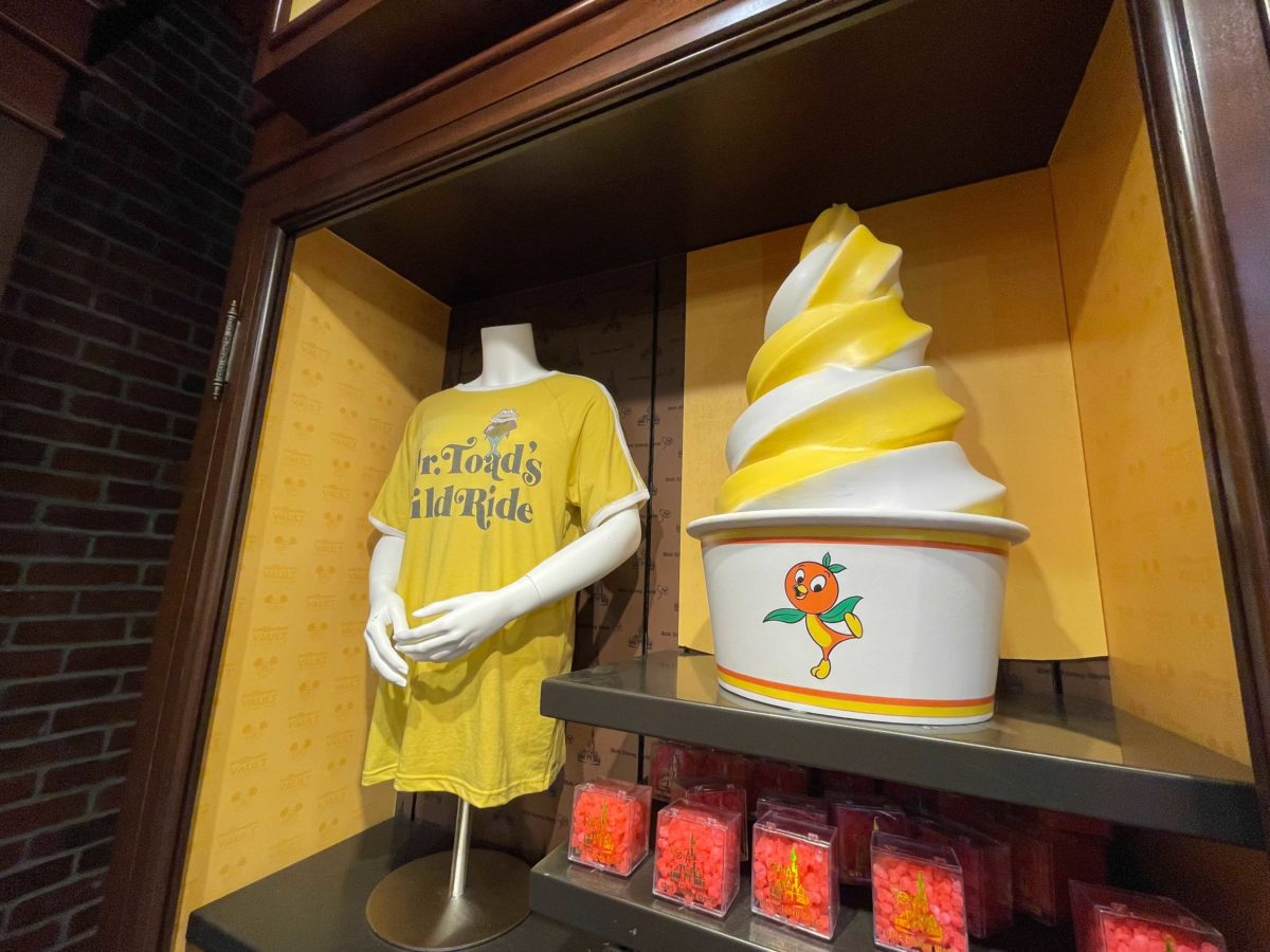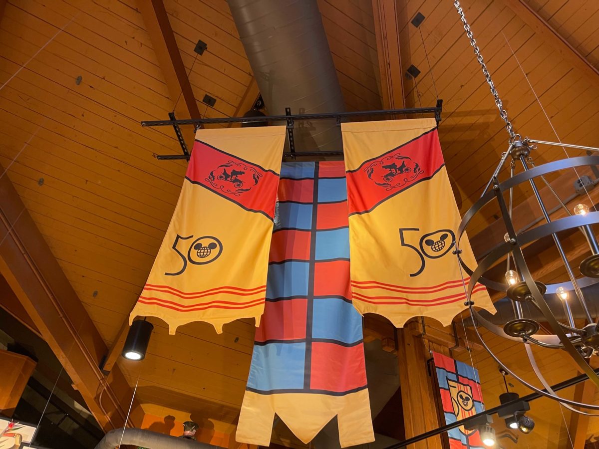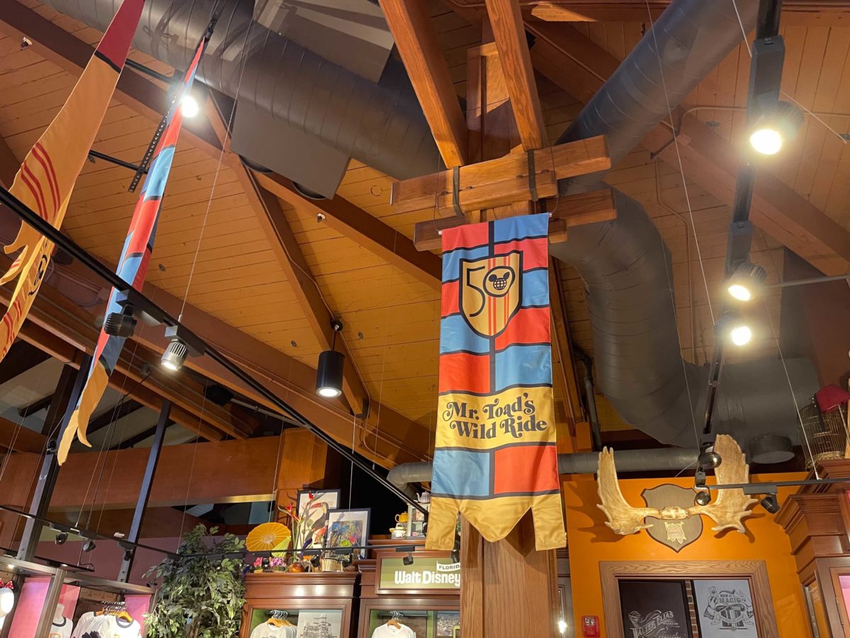 Above, banners inspired by those seen in Toad Hall from Mr. Toad’s Wild Ride hang from the ceiling.