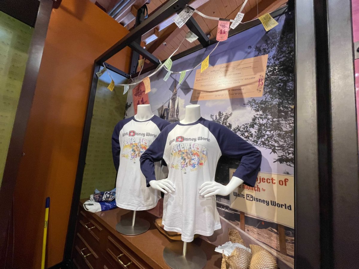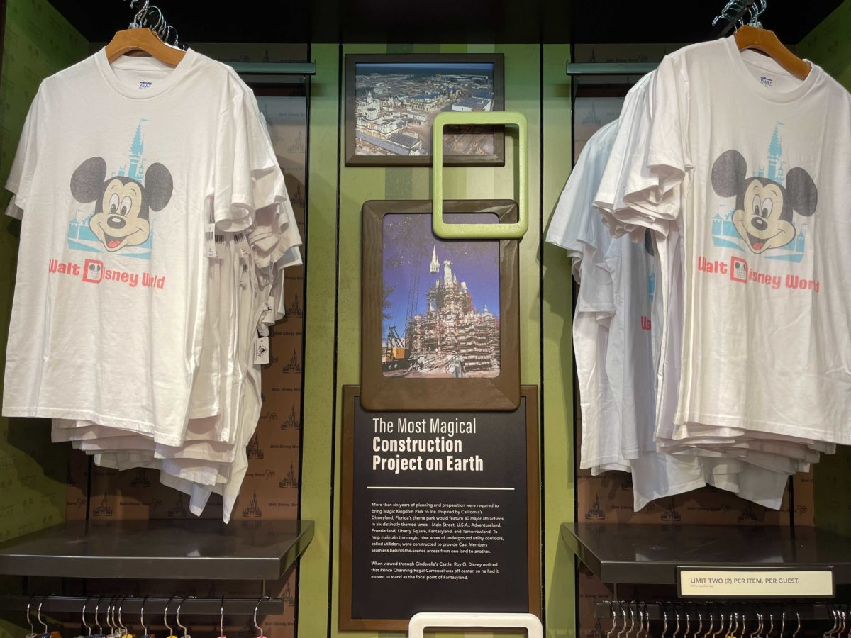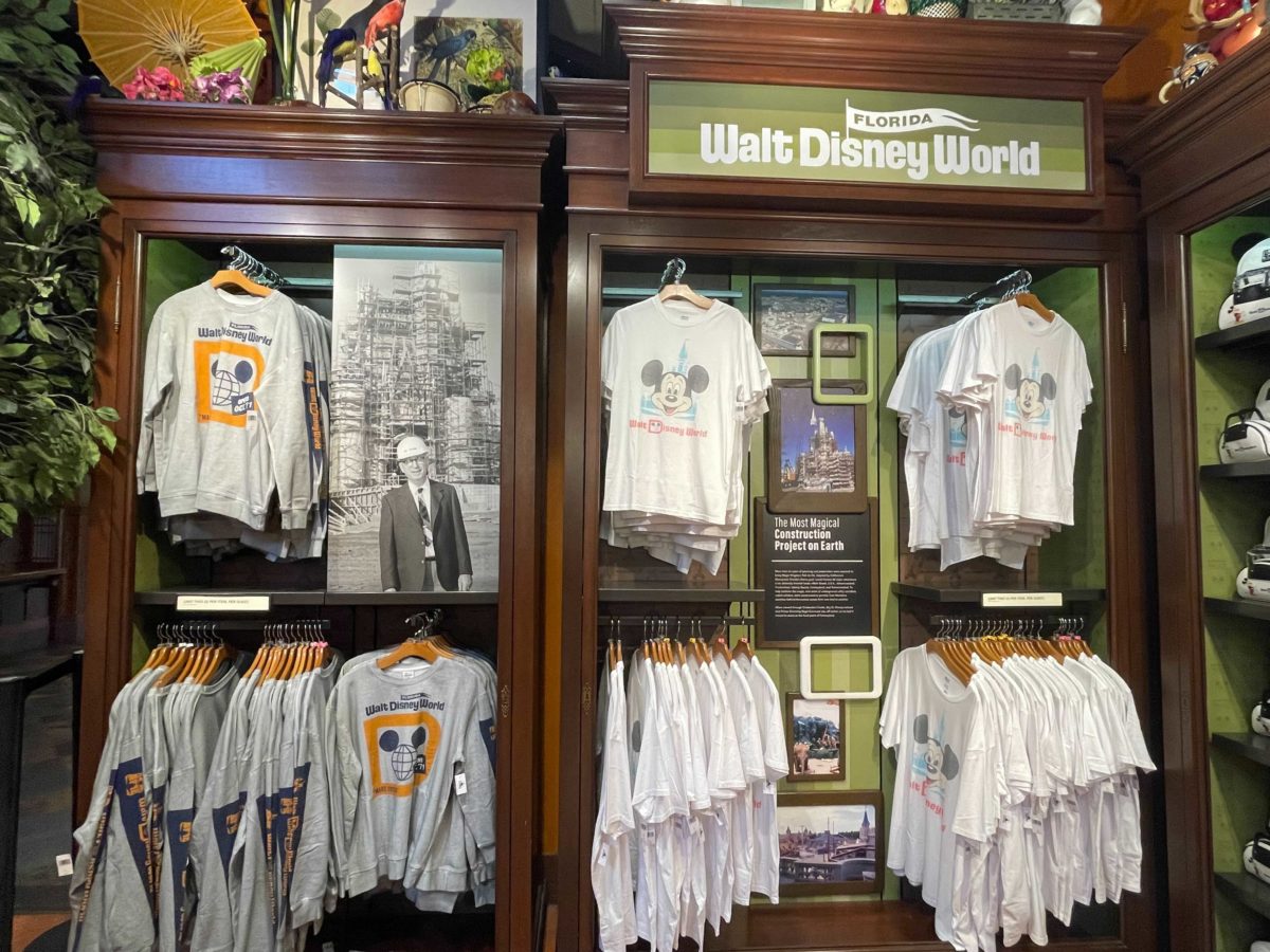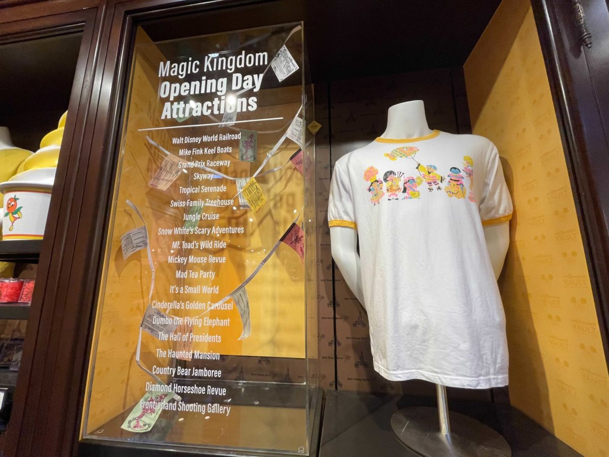Nearby, shirts with art from the Preview Center stand behind a display of ticket books, used in the resort’s first decade.