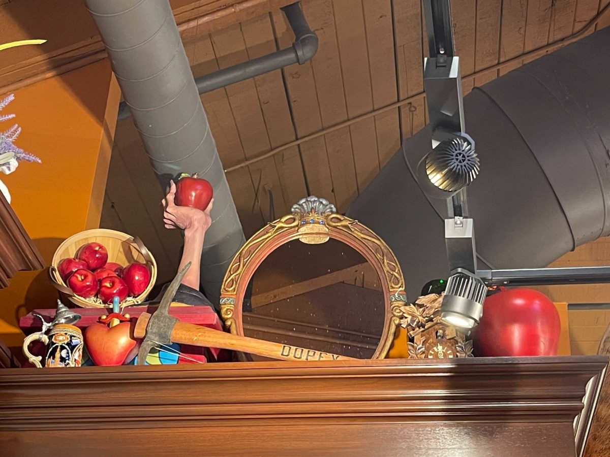 Apples, a magic mirror, and Dopey’s pickaxe represent Snow White’s Scary Adventures.