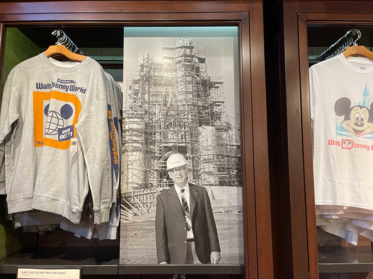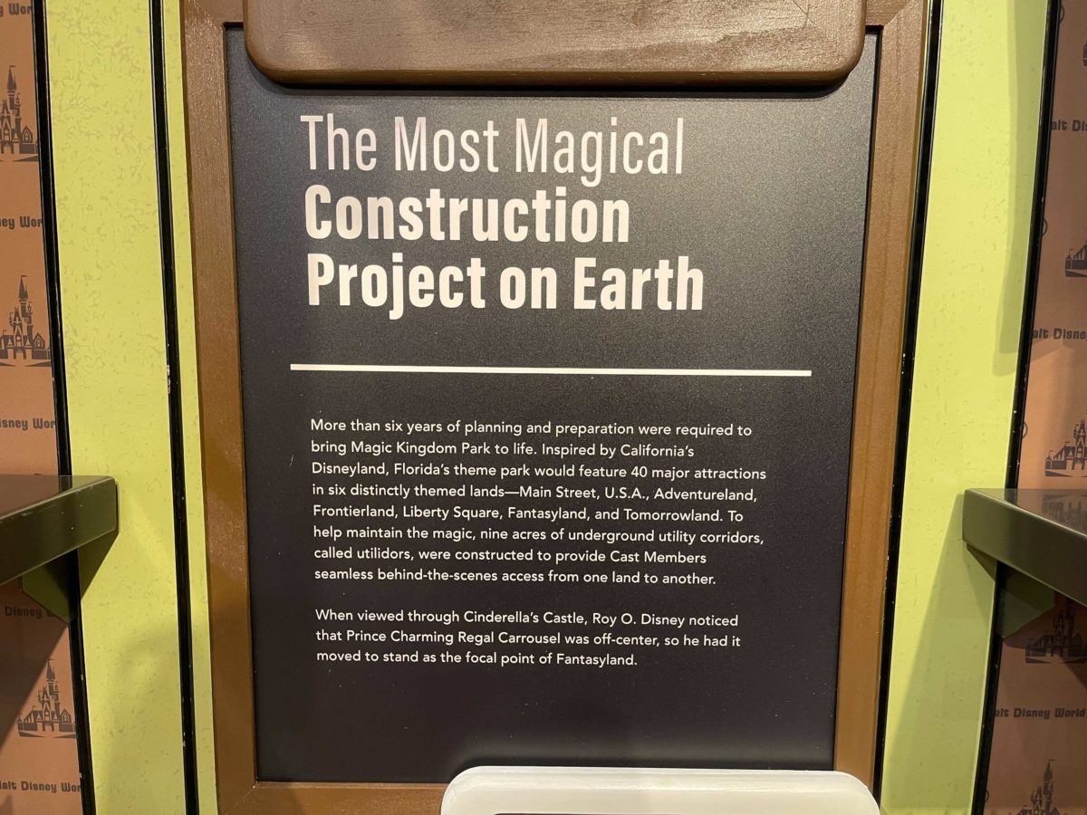 This display pays tribute to the construction of the resort, with a large photo of Roy O. Disney in front of a still-being-built Cinderella Castle.