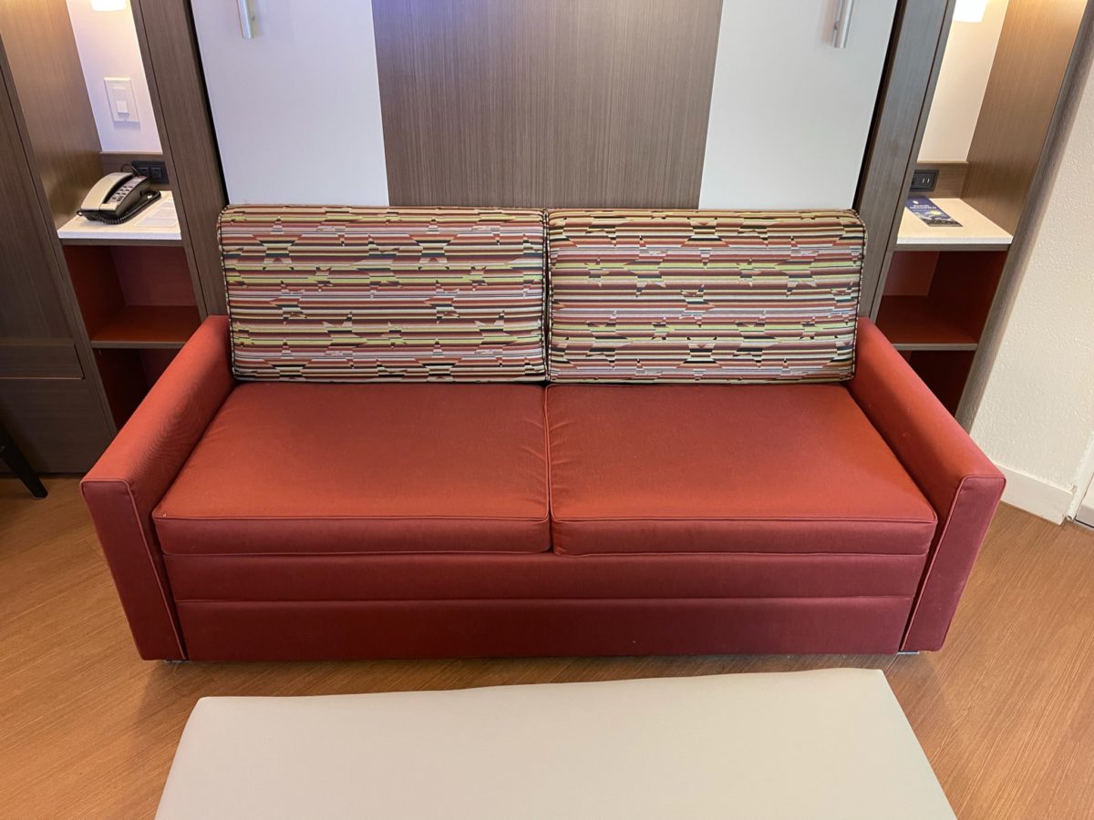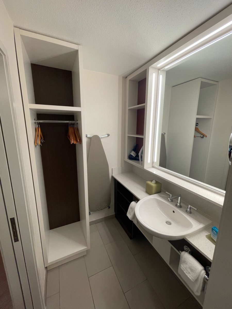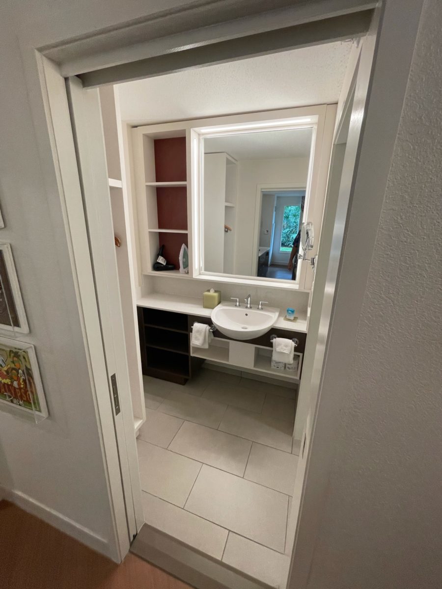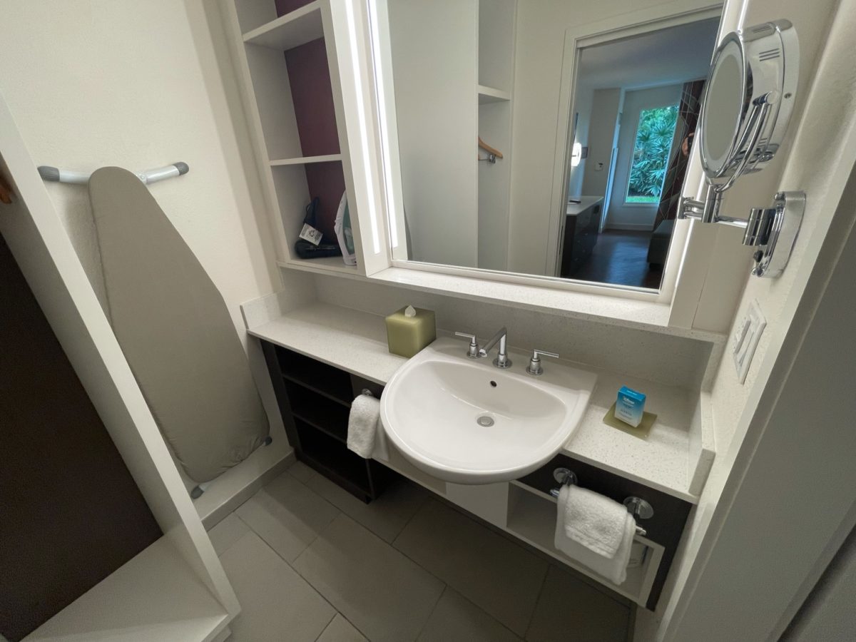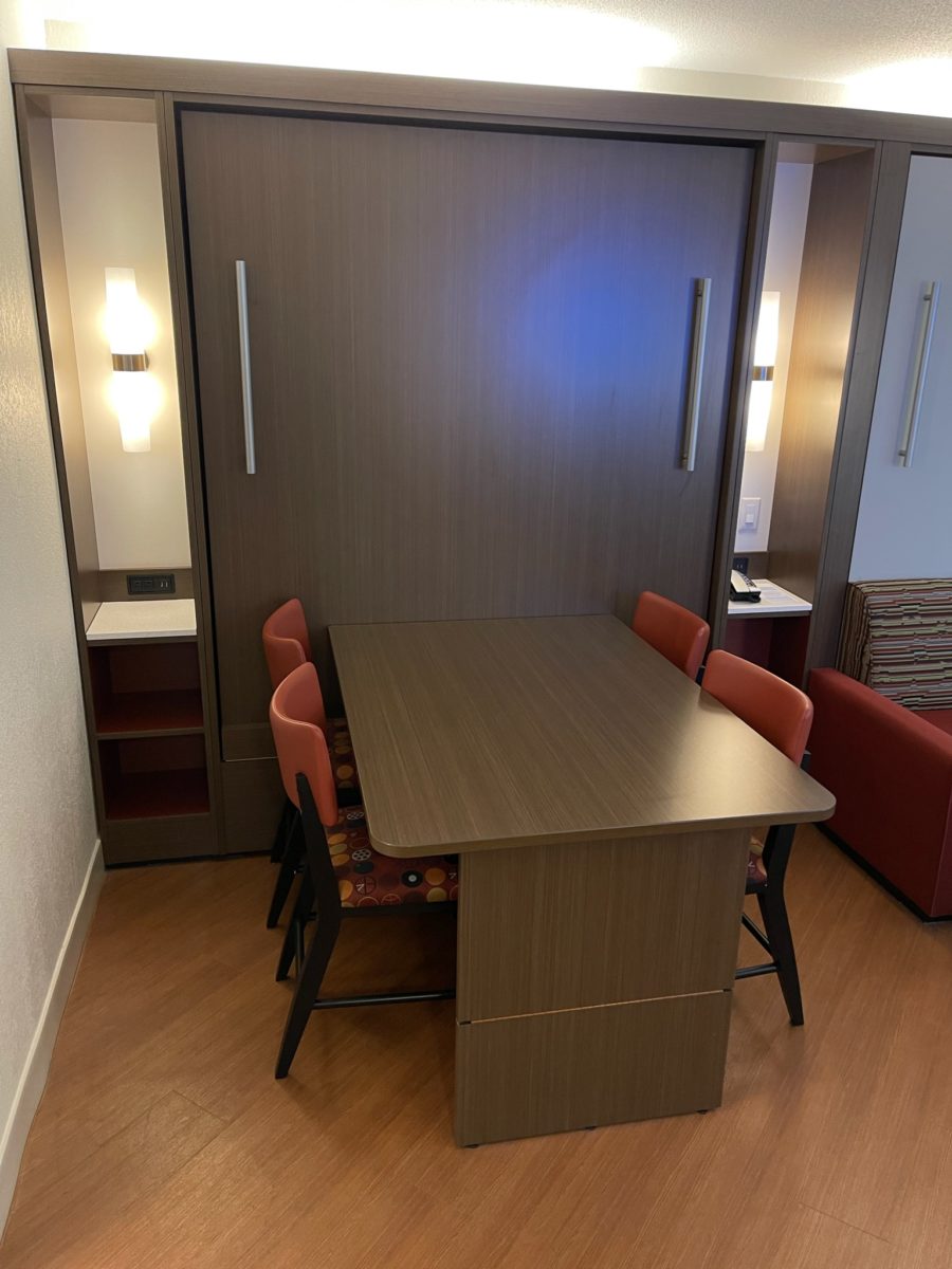 They put a lot into a small space. I can see a lot of stuff in those bathrooms (having the closet and ironing board in there). You have to be aware that pull down beds and sleeper sofas are not as comfortable as having a real bed. Here’s the order best to worst: conventional bed, pull-down murphy bed, and sofa sleeper. Murphy bed may work well for children. Adults may revolt and fight for the bed.