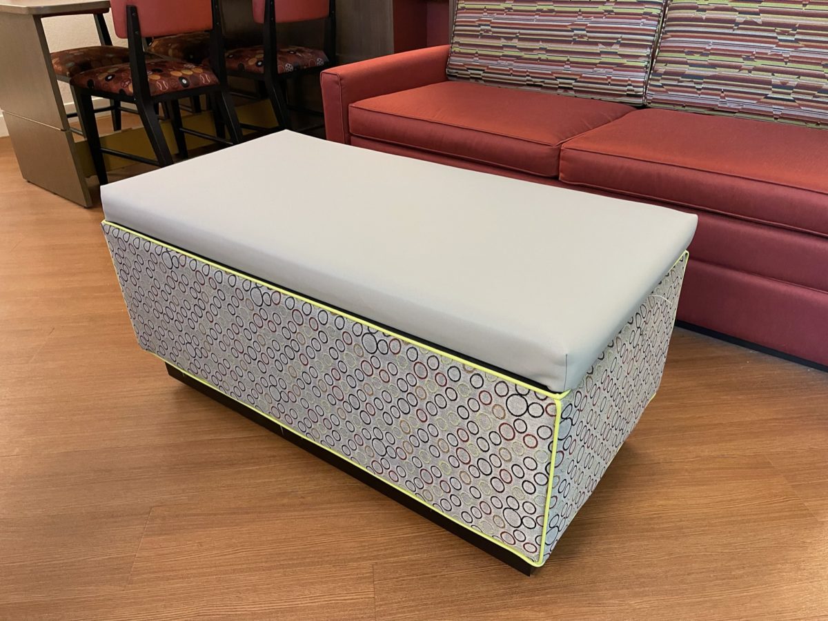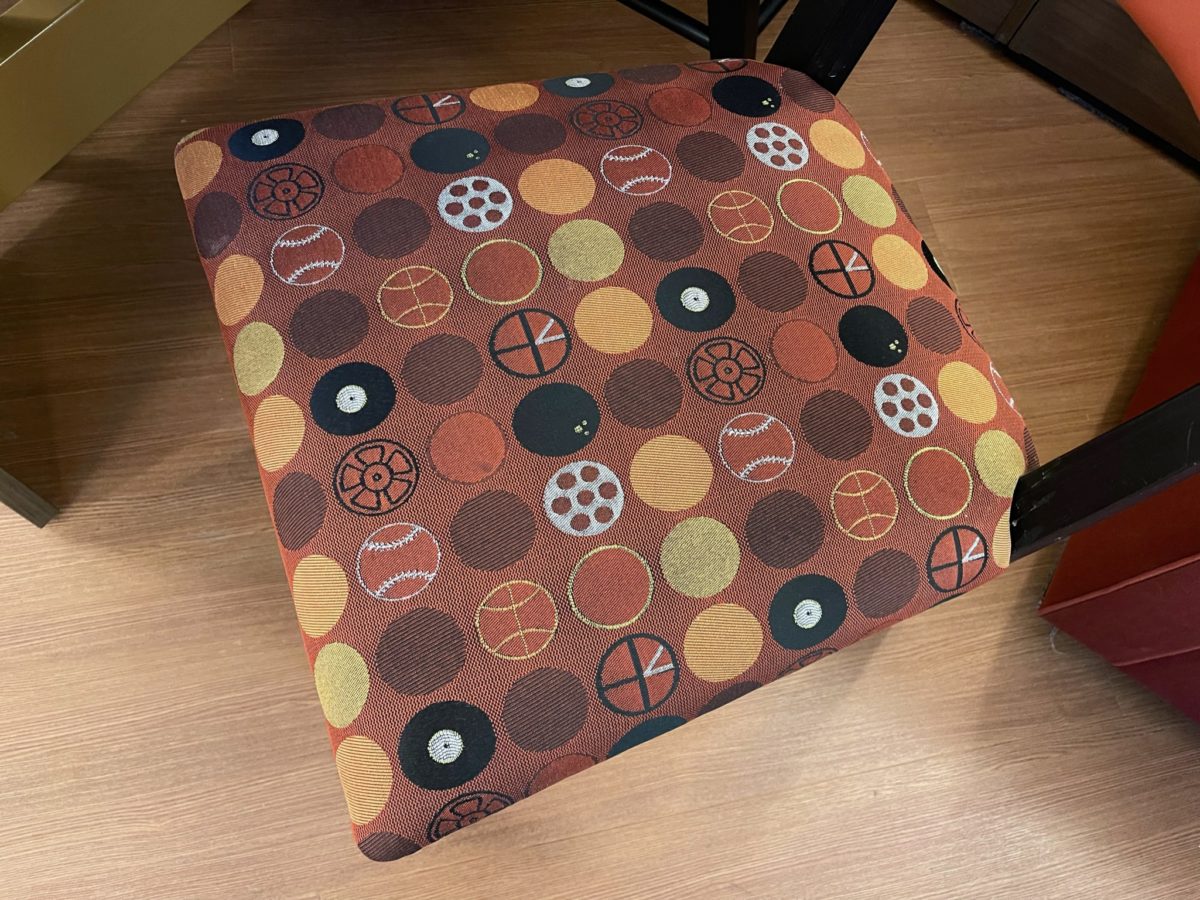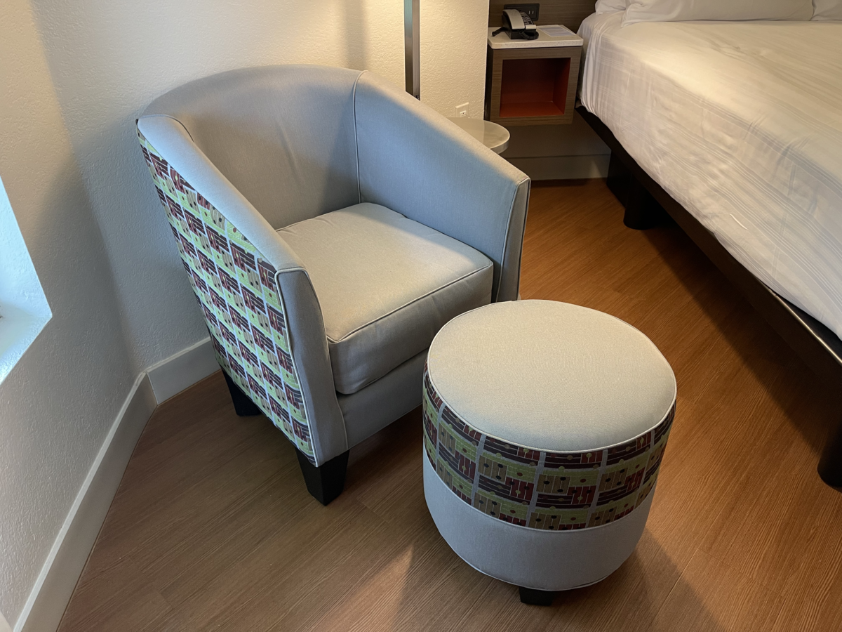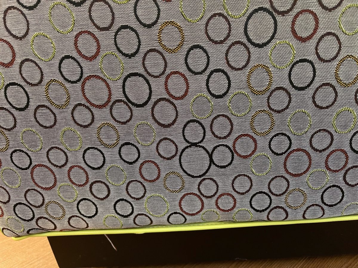 The ottoman is grey, with neon lining and colorful circles around the side.