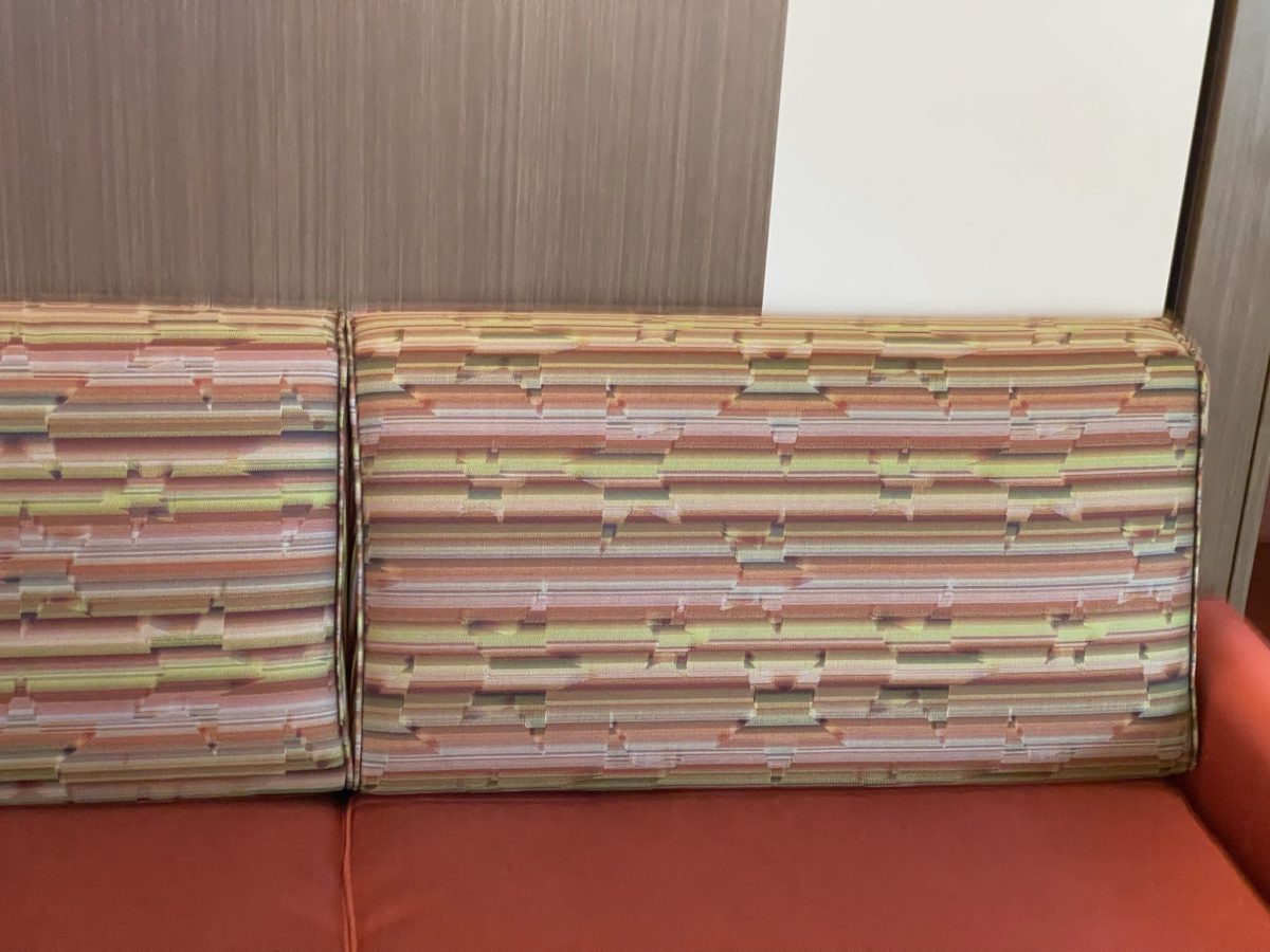 The sleek red sofa has an “all-star” striped design on its back cushions.