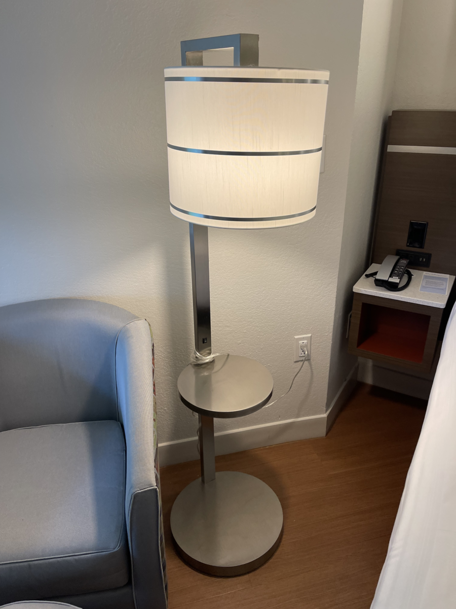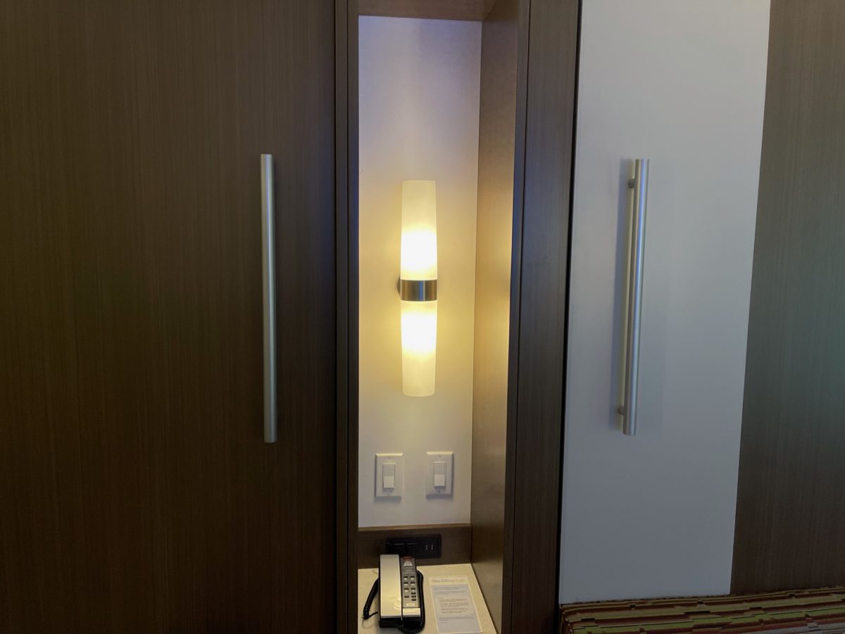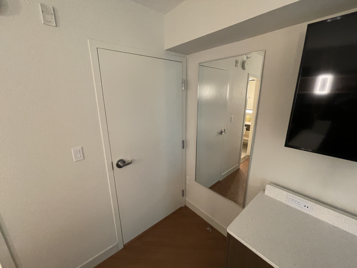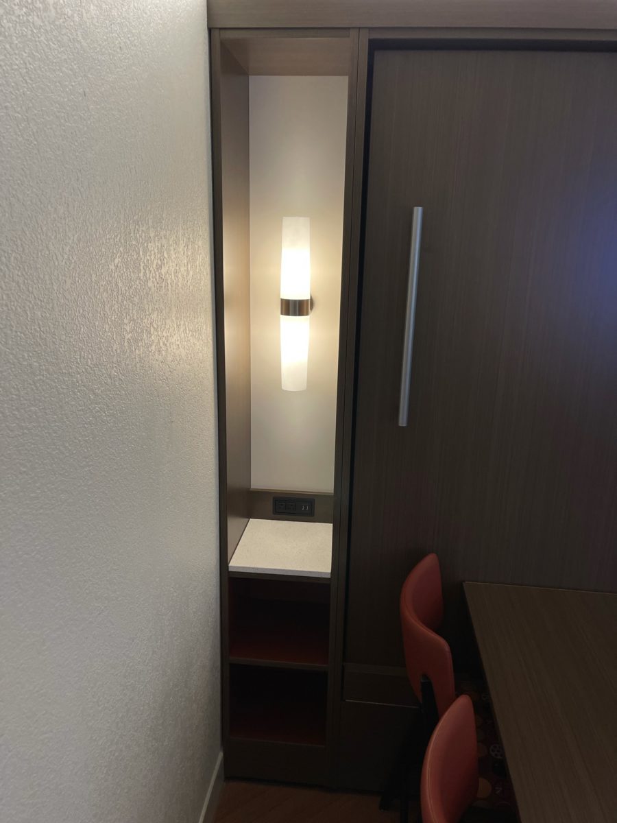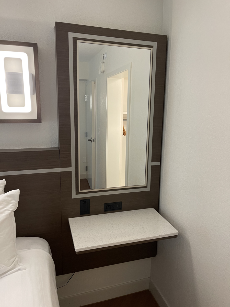 A tall fixated mirror with end table built into the headboard on the right side of the bed is a newer feature and also with the USB outlet.