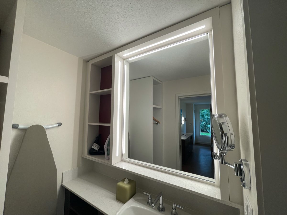 The large vanity mirror is backlit. A makeup mirror and outlets are on the wall.