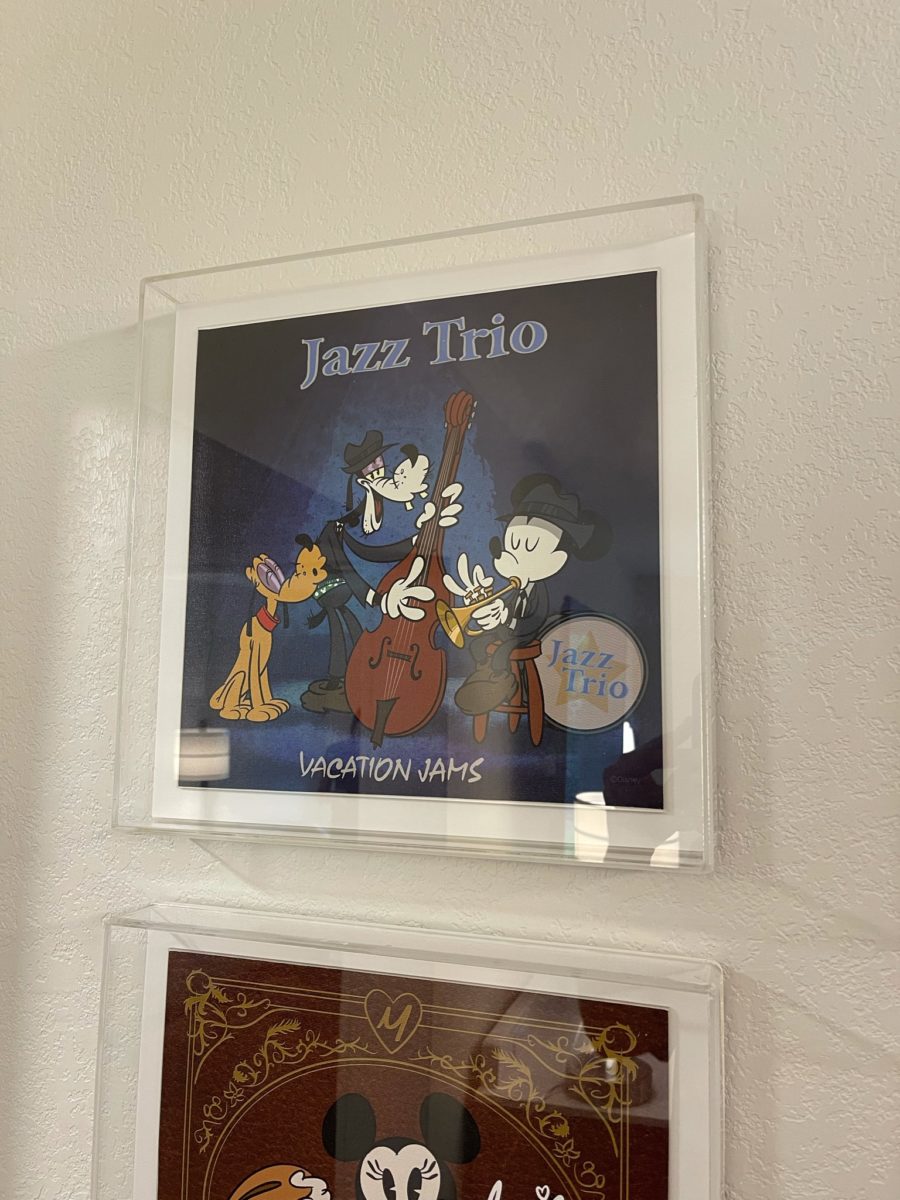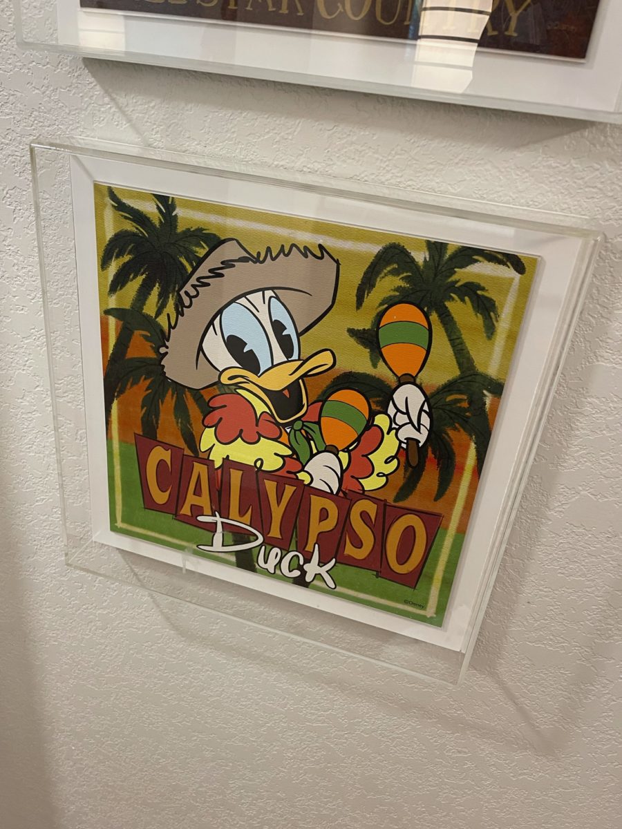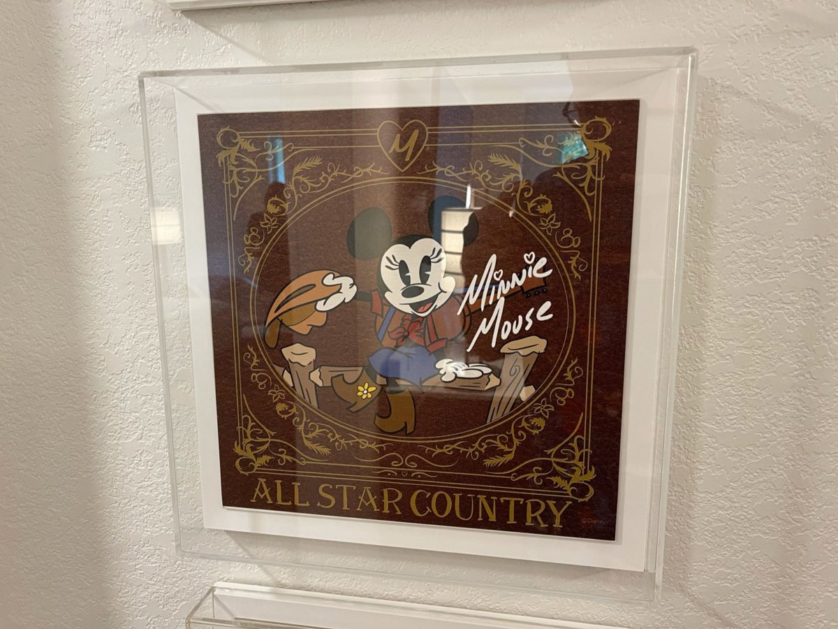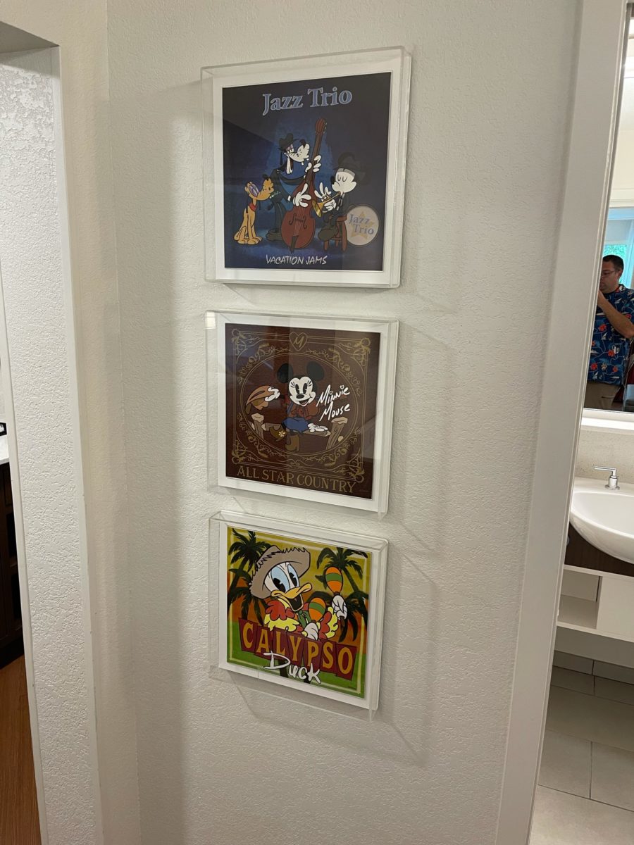 Next to the first bathroom is a row of artwork featuring different Disney characters.