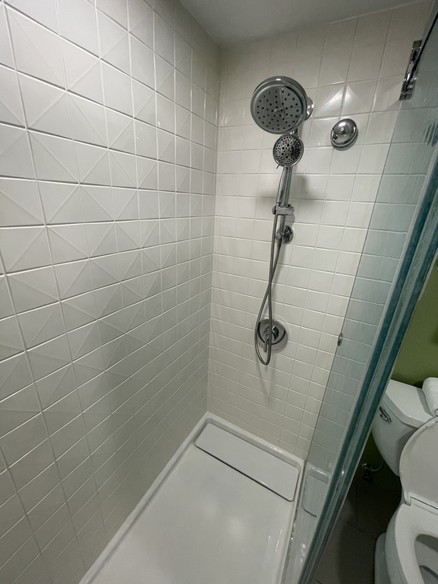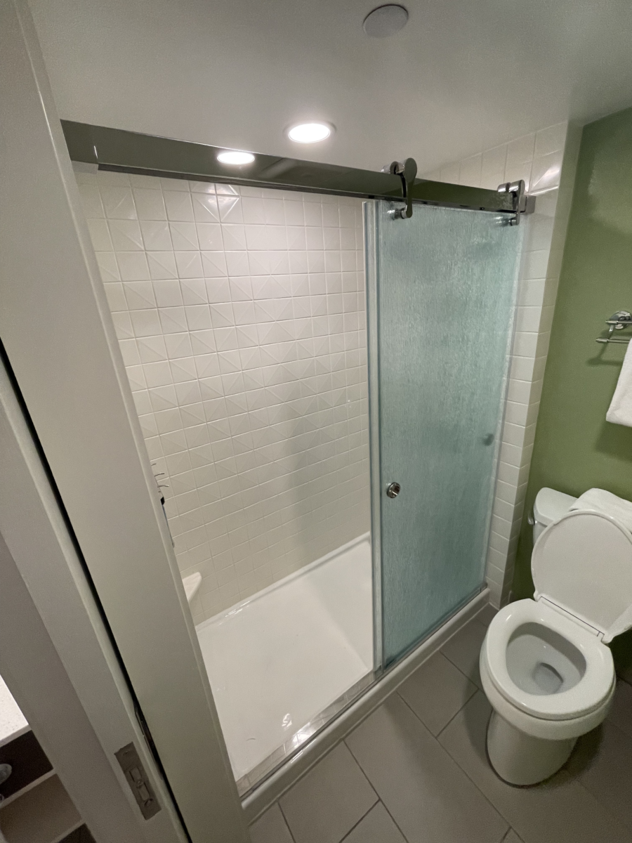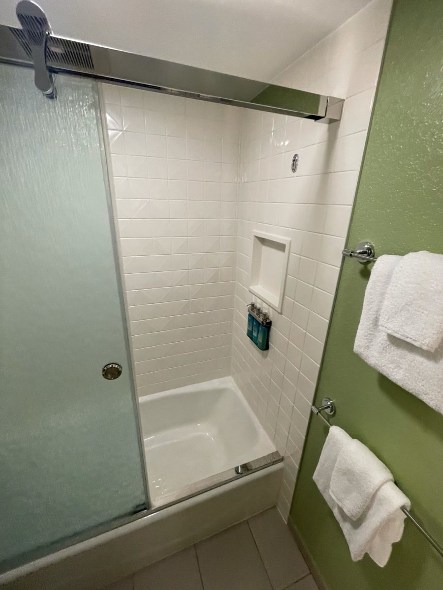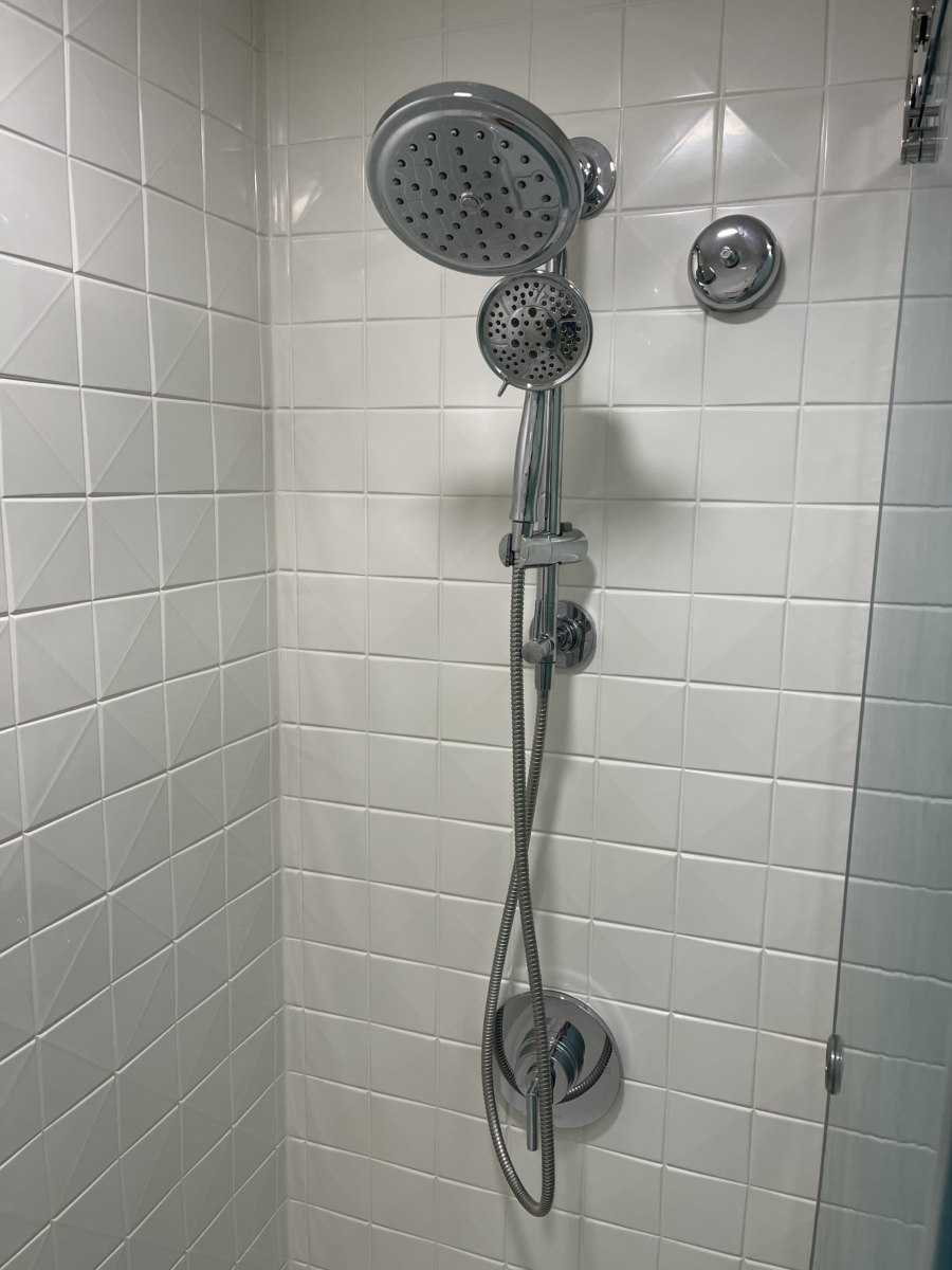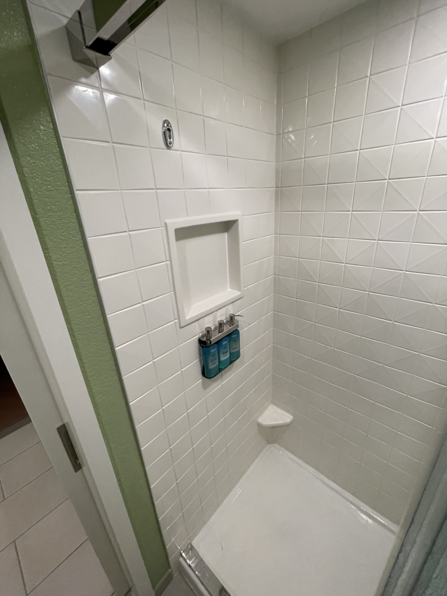 The walk-in shower includes mounted H20+ shampoo, conditioner, and body wash below a cubby for toiletries.