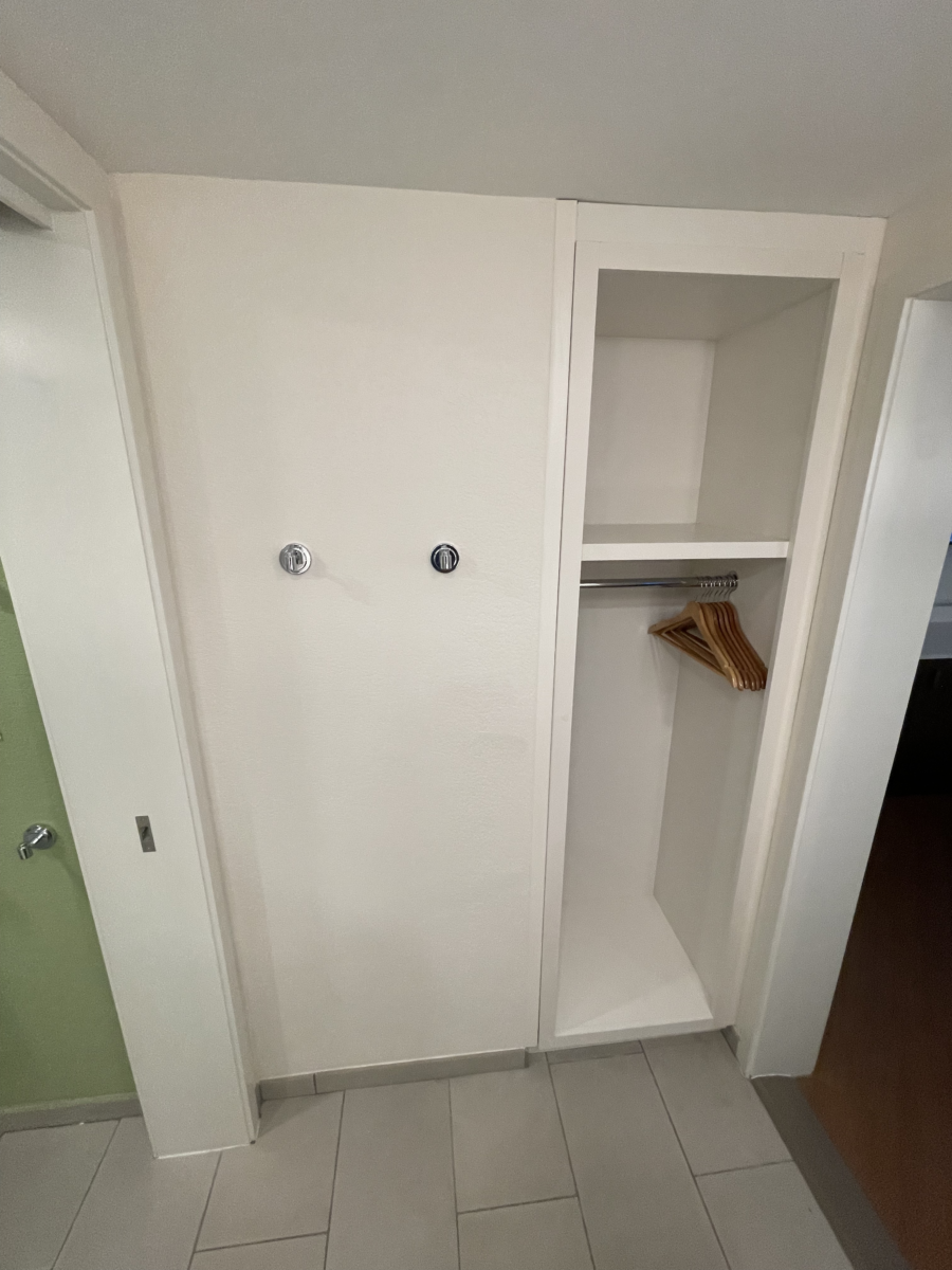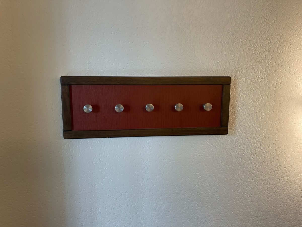A rack of hooks isn’t far from the door, perfect for hanging hats or masks.