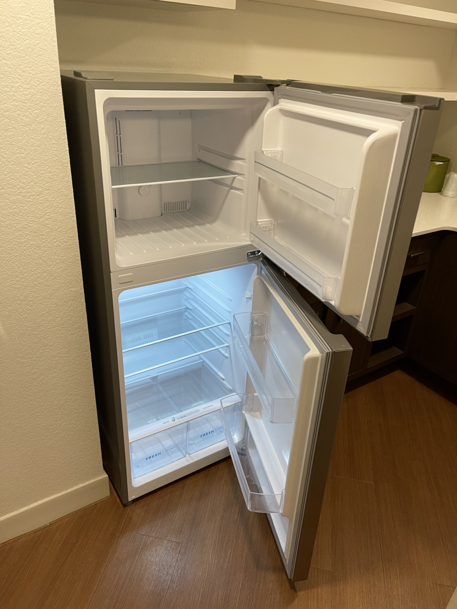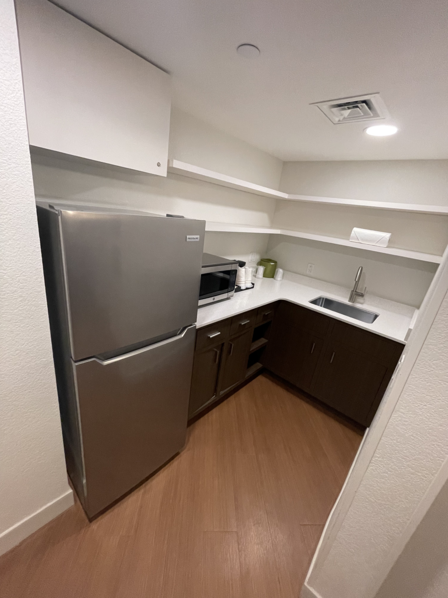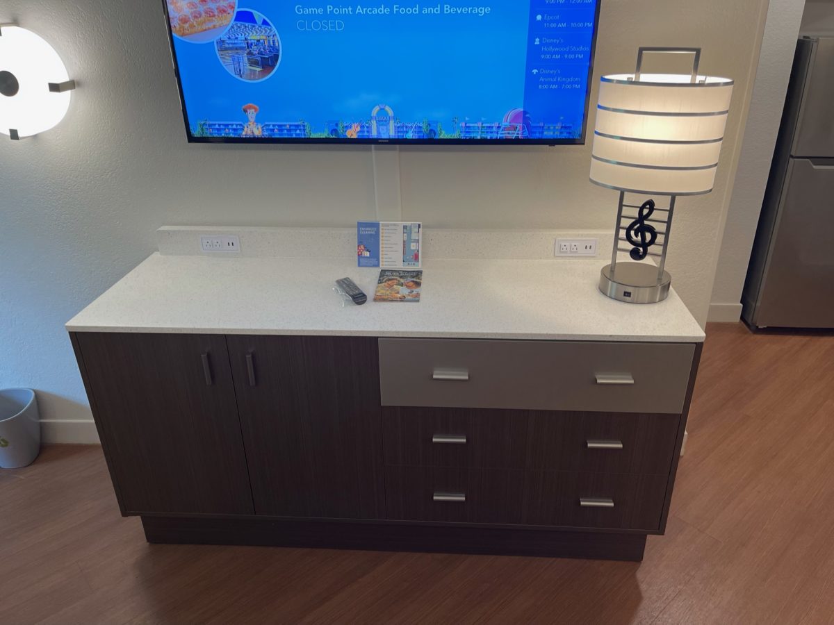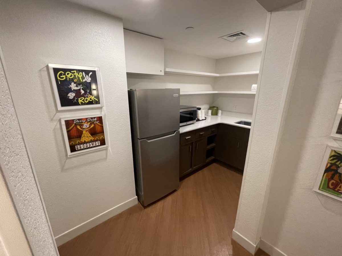 A decently sized kitchenette is just off of the living room and includes a microwave and refrigerator with ‘Goofy Rock’ and ‘Daisy Duck Broadway’ artwork.