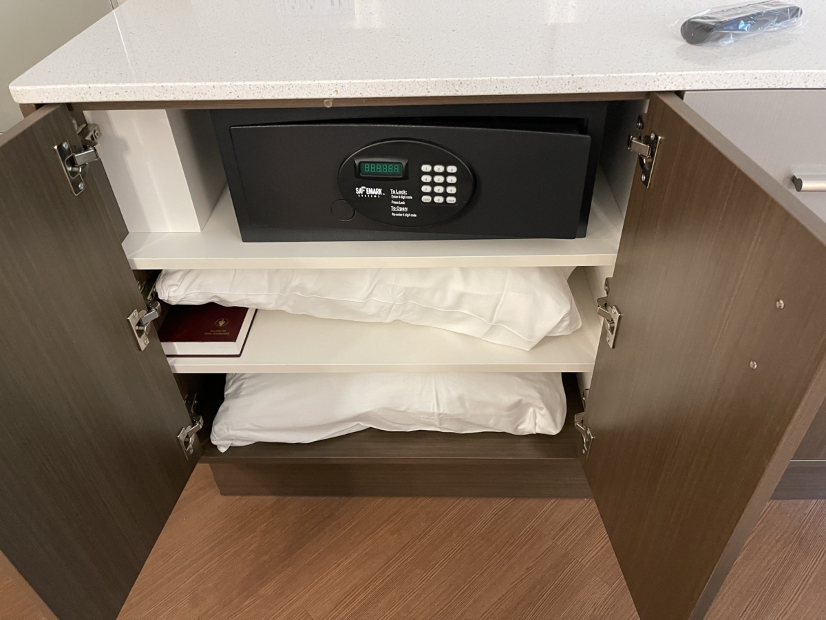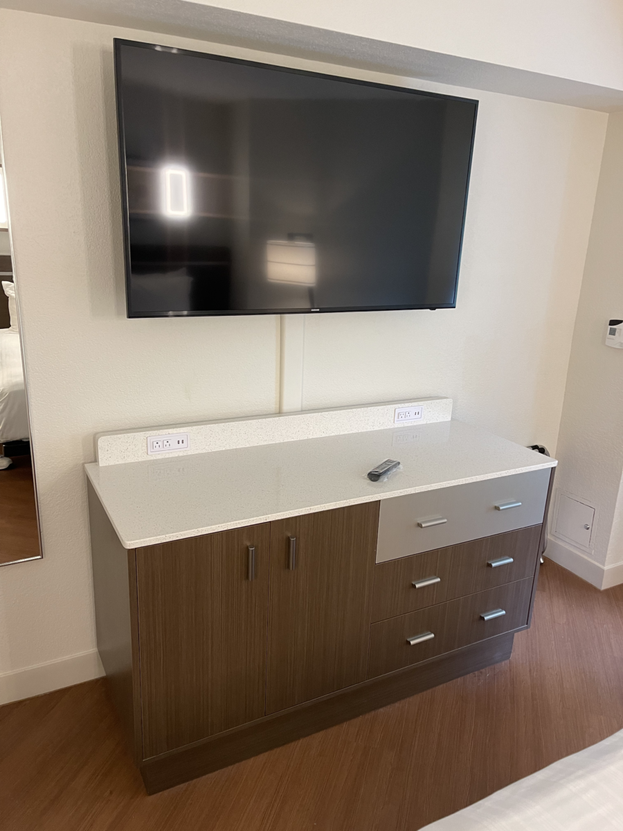 Two outlets with USB ports are on the television set dresser with a safe and extra pillows underneath.