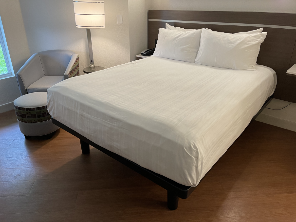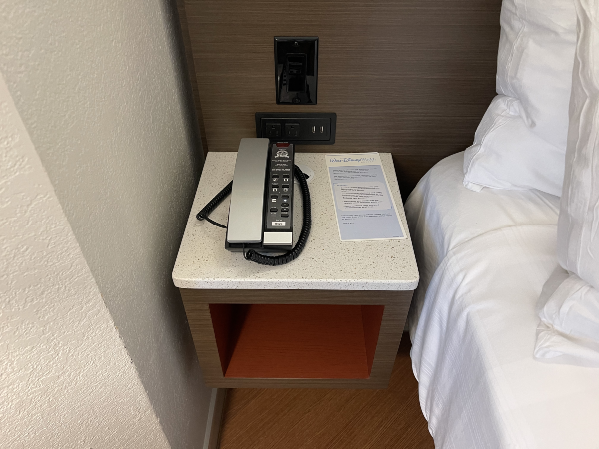 To the left of the bed, a cubby night stand is complete with the two standard USB ports and outlets.