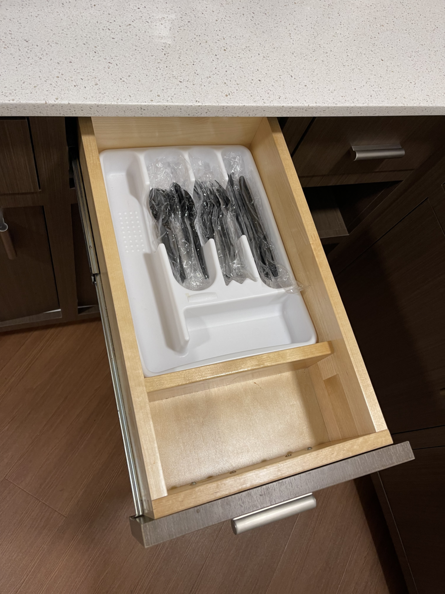 Although the bottom cabinet drawers are not lined up correctly, there is a good amount of storage space underneath the countertop.