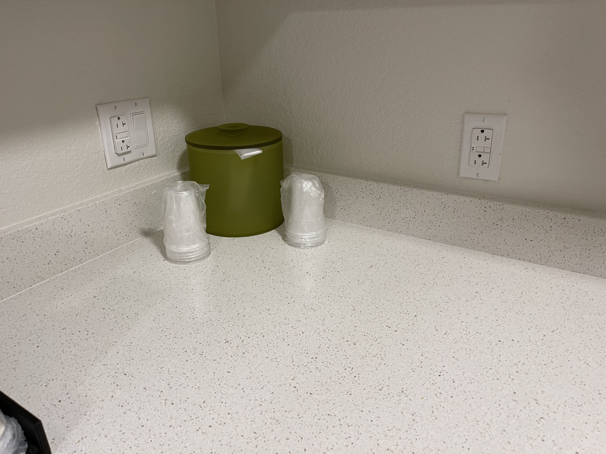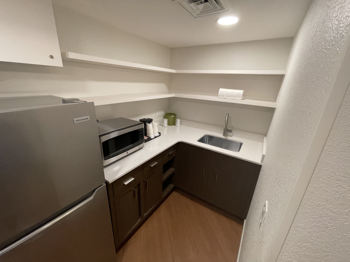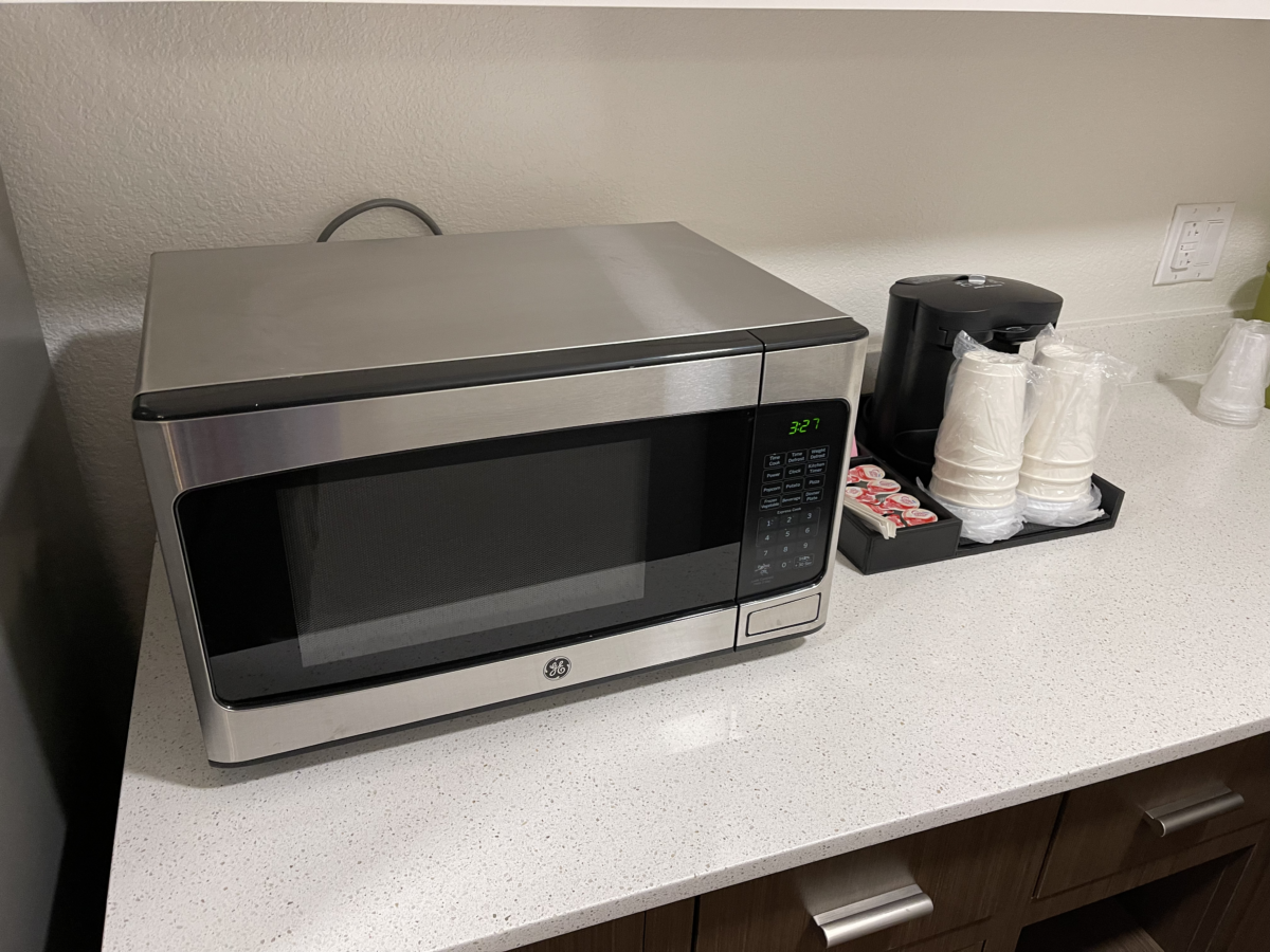 A small coffeemaker, cups, and ice bucket are provided on the countertop next to the microwave.
