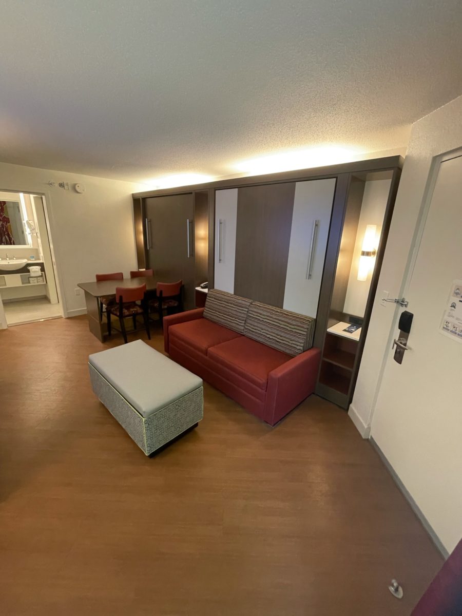 When the beds are folded up, a table with four chairs, a sofa, and ottoman are available.