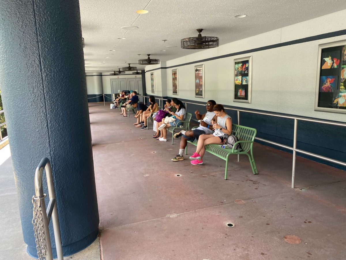 A handful of benches have been moved into the queue, which has large ceiling fans.
