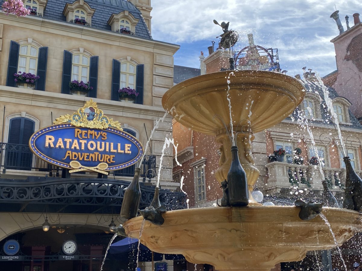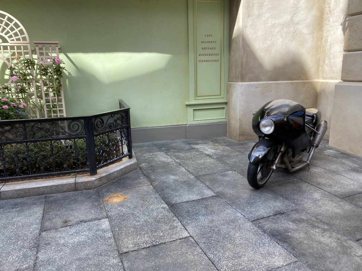 Near Remy’s Ratatouille Adventure, Chef Skinner’s red scooter has been removed, leaving only Colette’s scooter available for photo opportunities. It may be back after a refurb; we’ll keep an eye out.