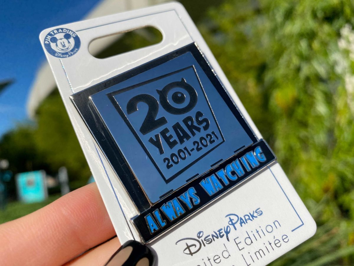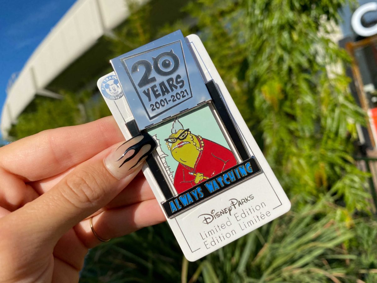 The Roz pin features a panel that slides up and down on the front of the pin. You can slide it up to reveal Roz’s glare or slide it down to hide her. It says “Always Watching” at the bottom. The front of the sliding panel says “20 Years” and “2001 – 2021.”