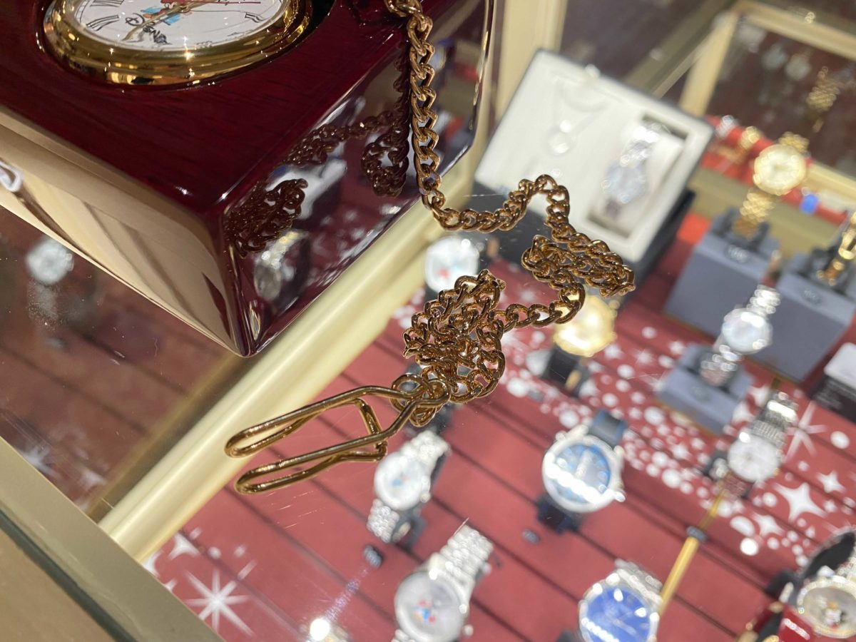Attached to the watch is a gold chain with a clip, typical of the style.