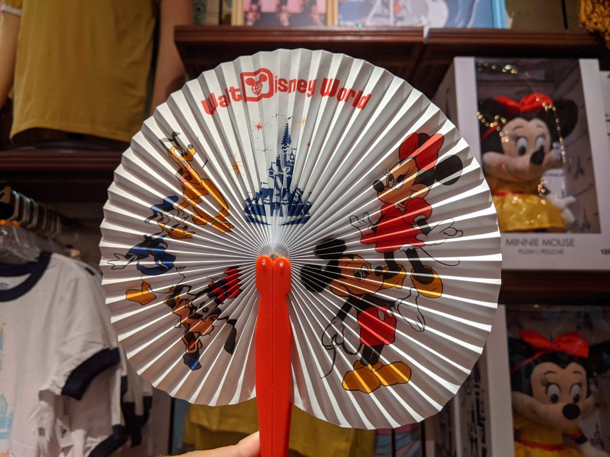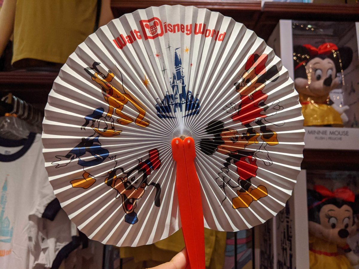 Mickey, Minnie, Pluto, Donald, and Goofy are printed on the fan, along with Cinderella Castle and the vintage Walt Disney World logo.