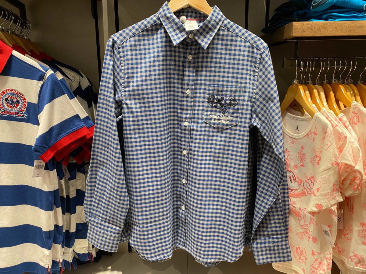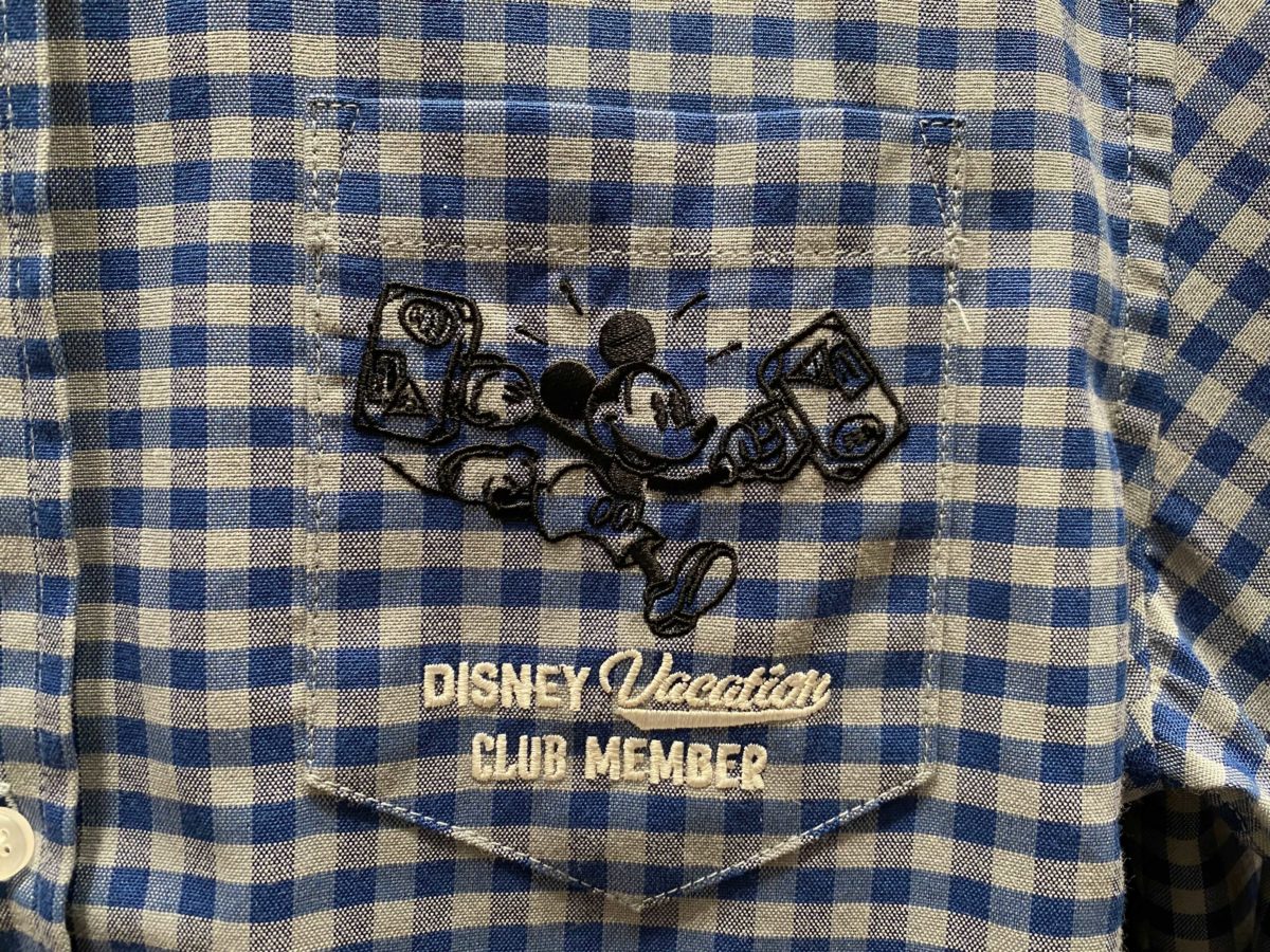 The blue and white checked shirt has an embroidered Mickey, rushing to his next DVC vacation. Disney Vacation Club Member text is embroidered in white.