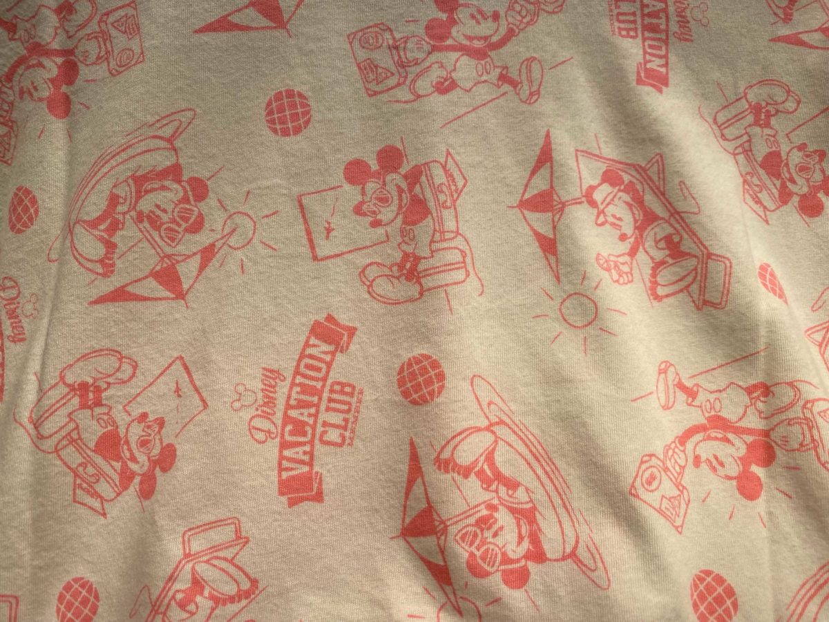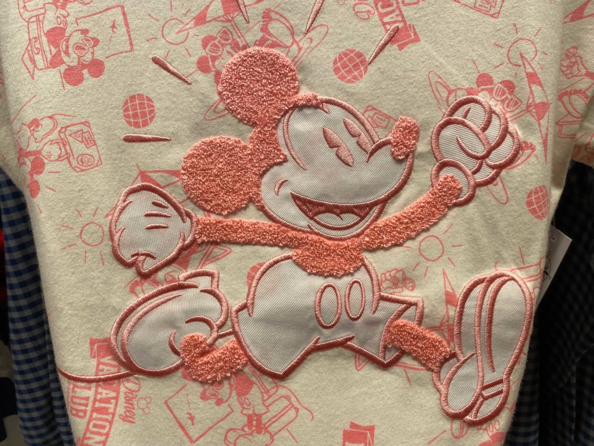 An embroidered and chenille Mickey Mouse is atop the same vacationing Mickey artwork used for the ears.