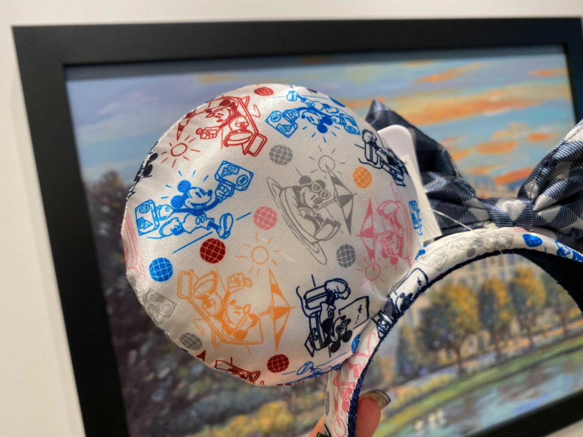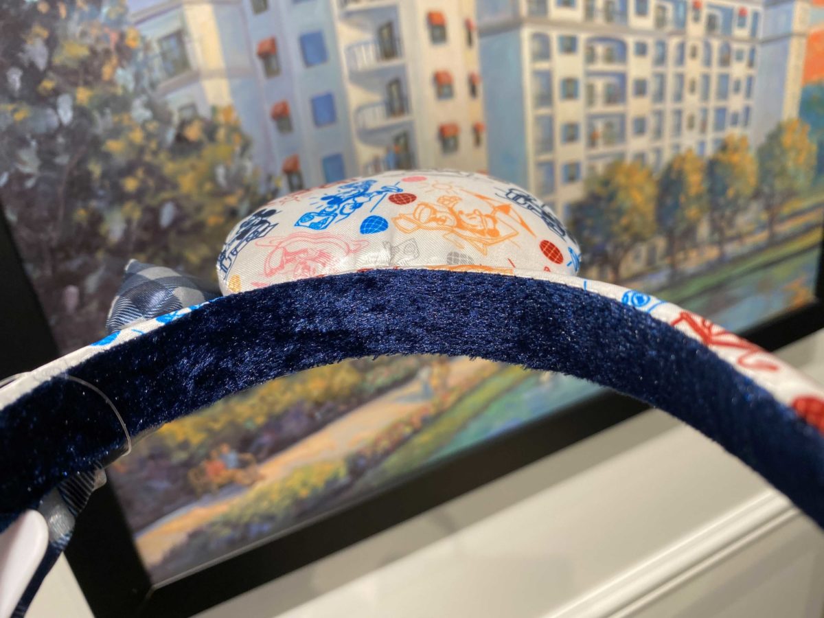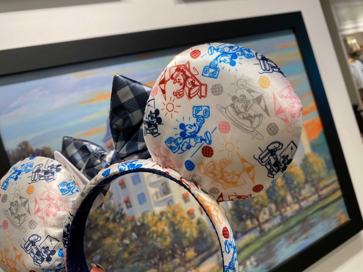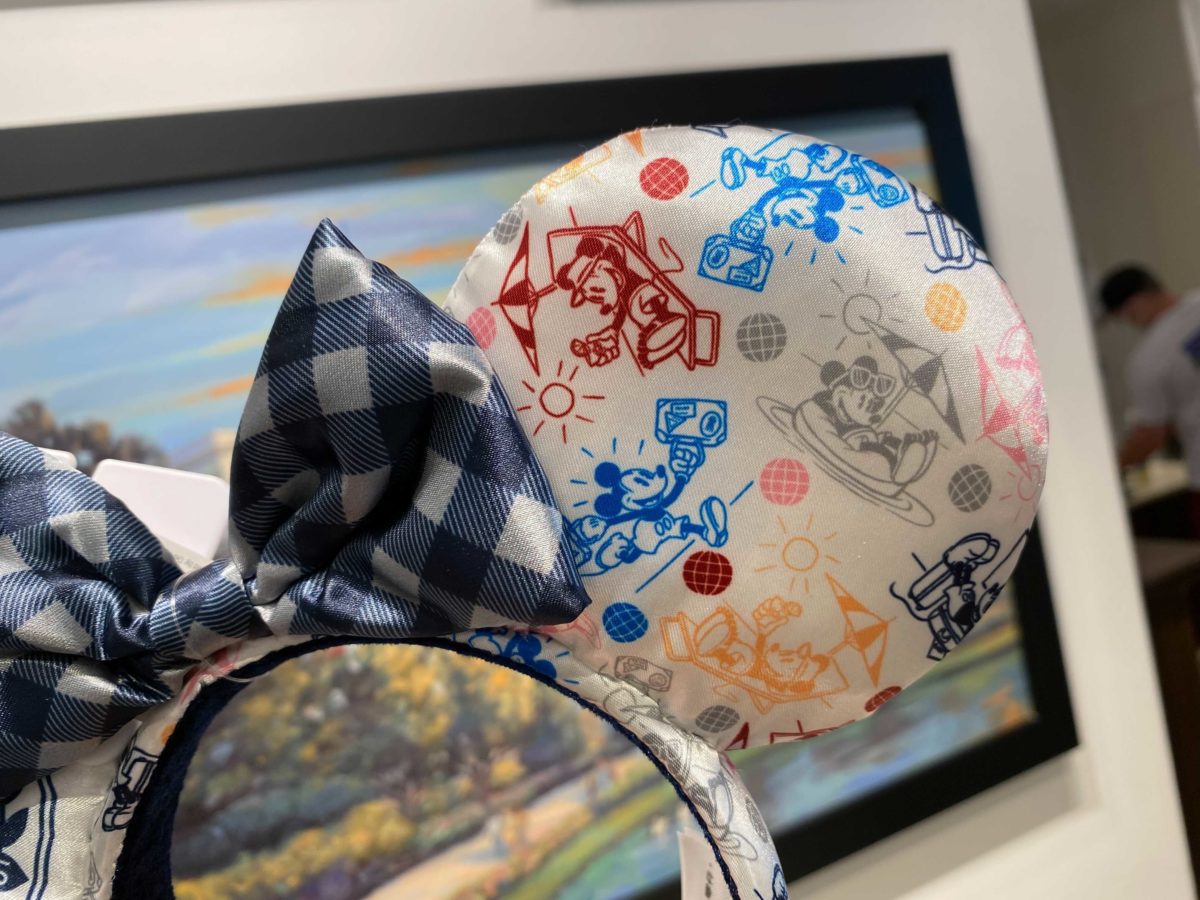The opposite ear has Mickey both heading to and enjoying vacation. A checked bow sits between the two ears.