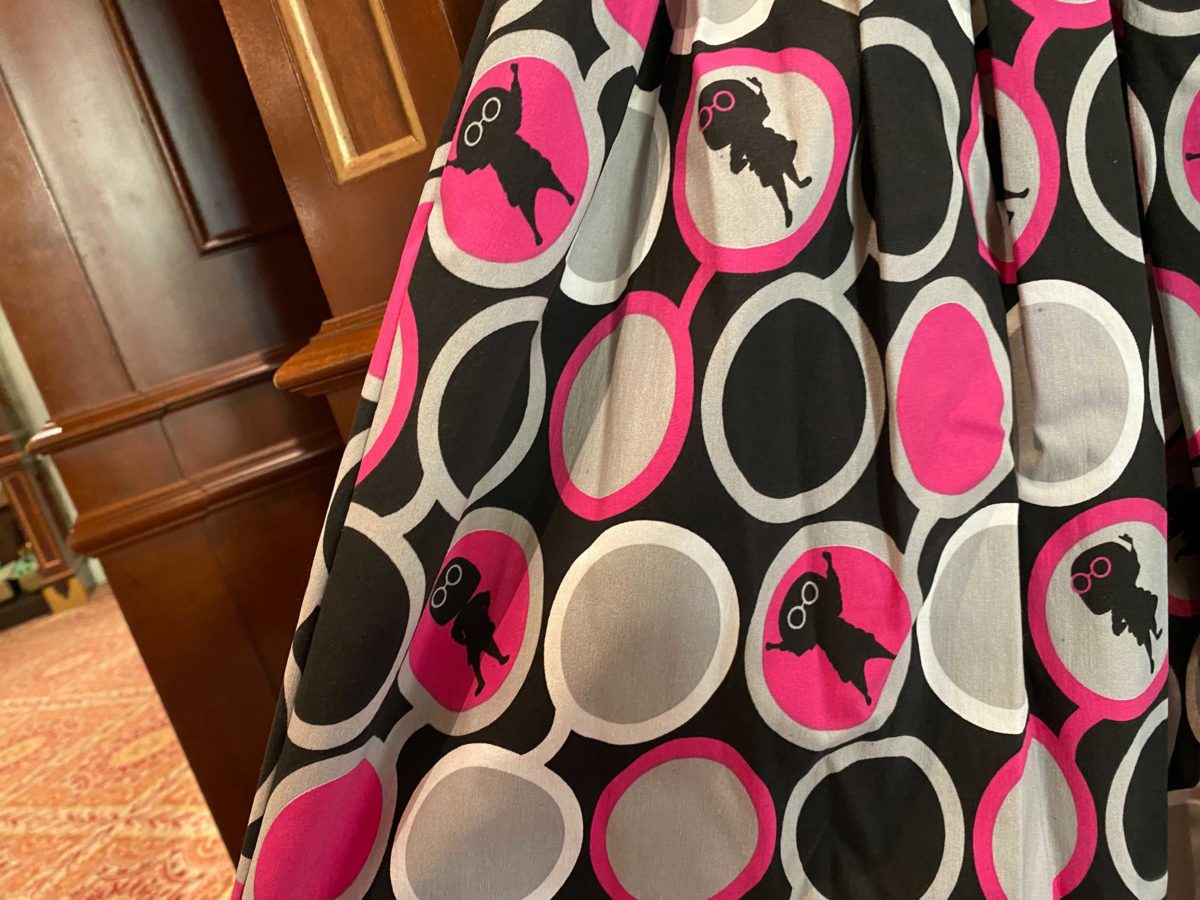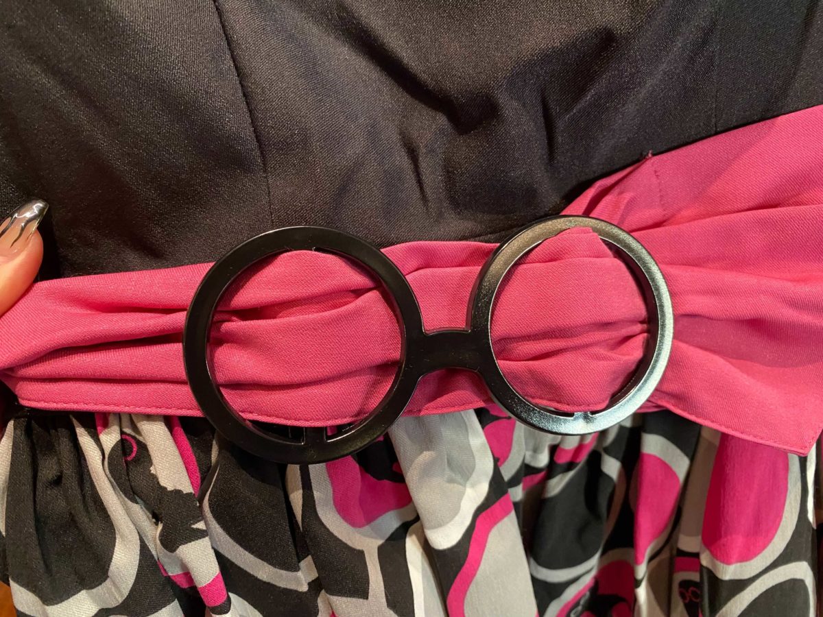 The pink ribbon at the waist has a black version of Edna’s glasses attached to it.