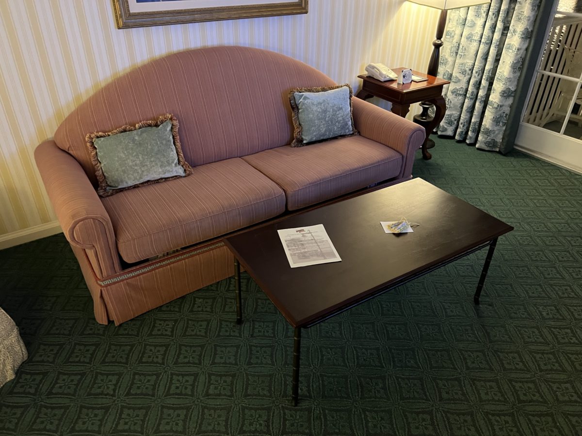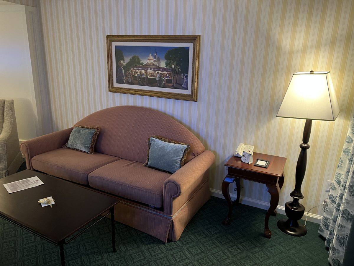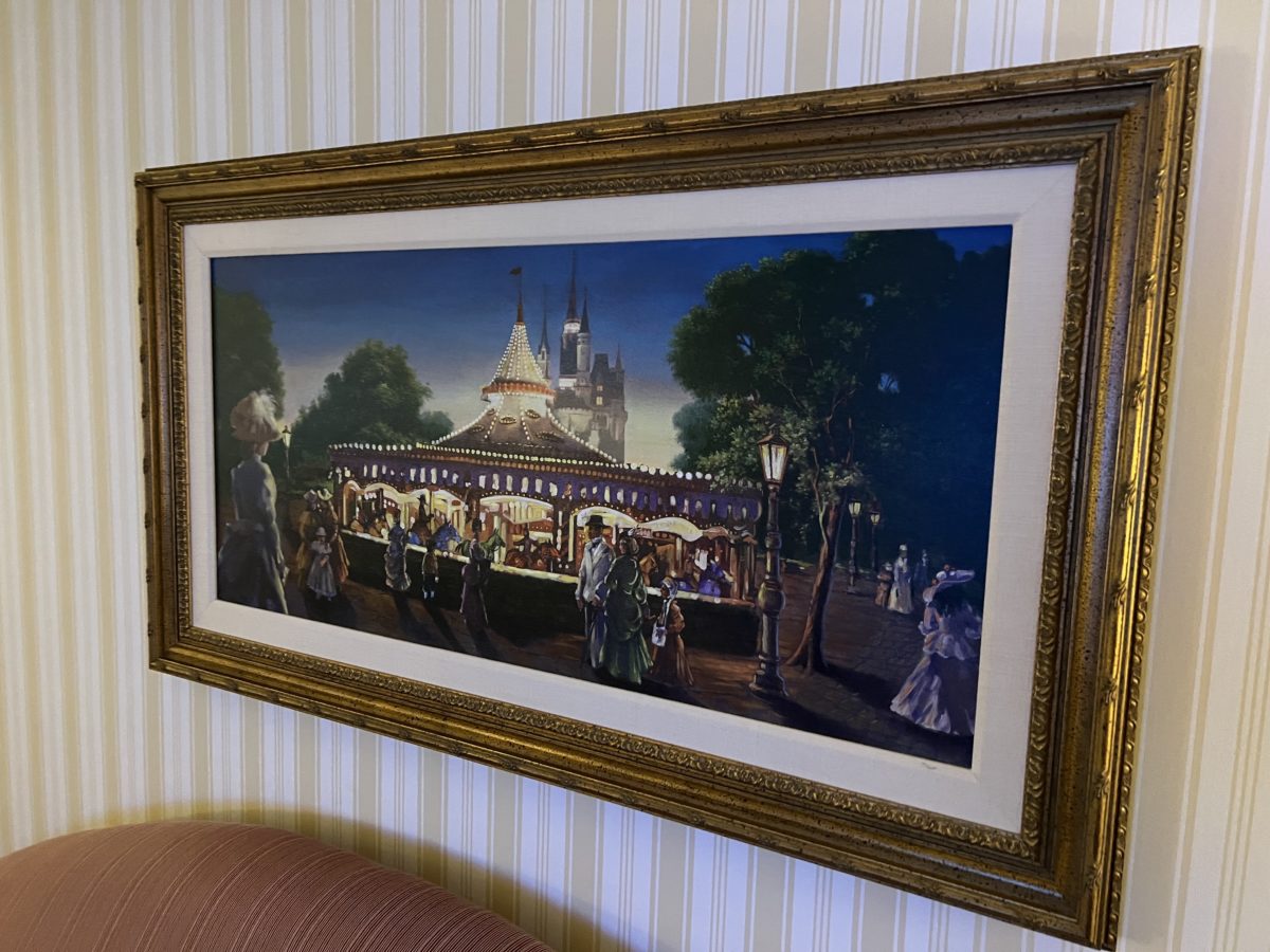 The frame above the couch features a painting of Prince Charming Regal Carousel in Magic Kingdom.