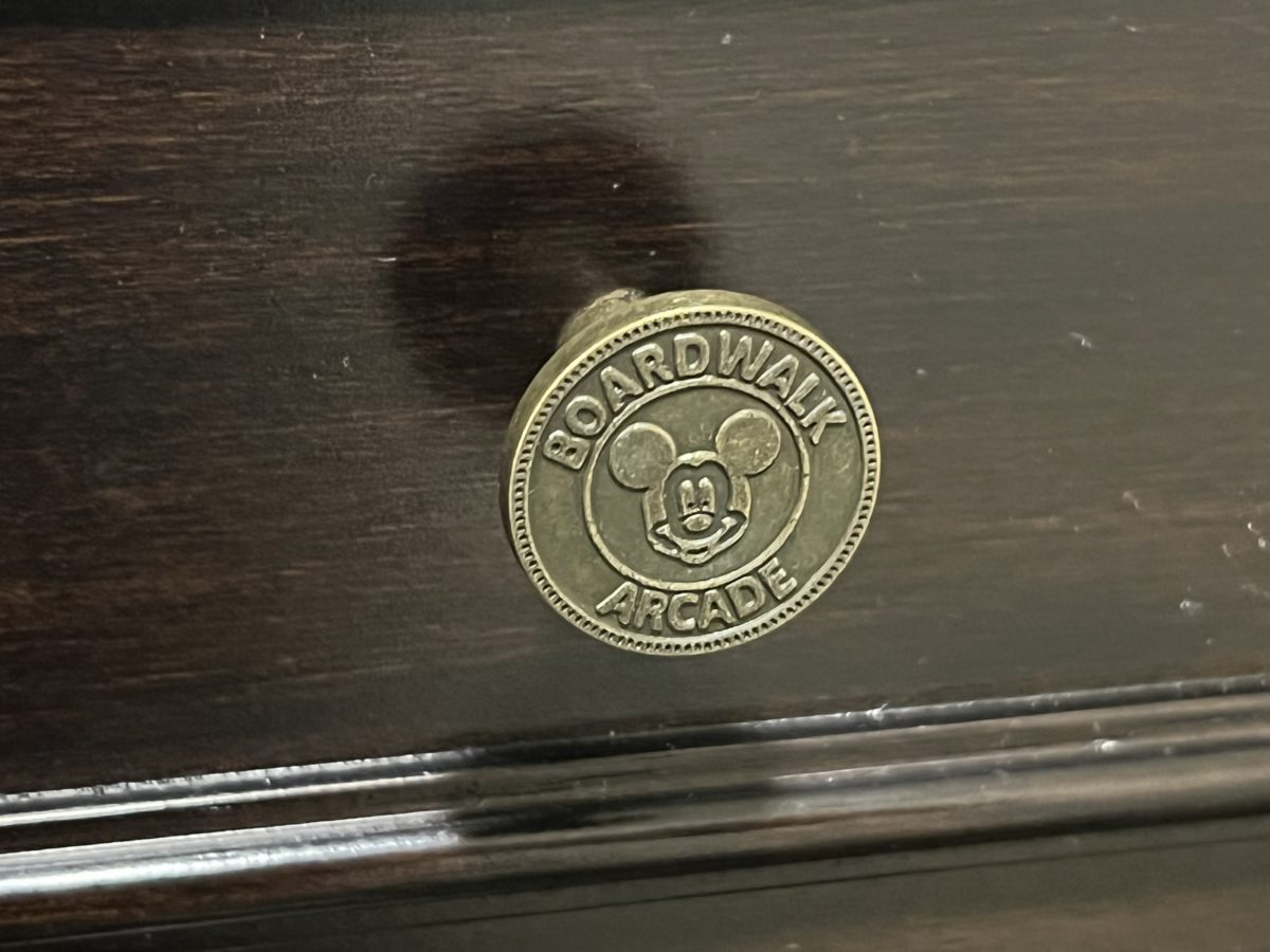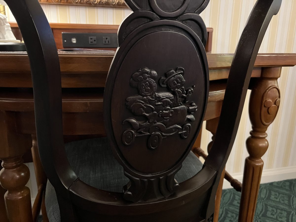 The chair also features Mickey and Minnie Mouse and it looks like they’re taking a ride down the Boardwalk.