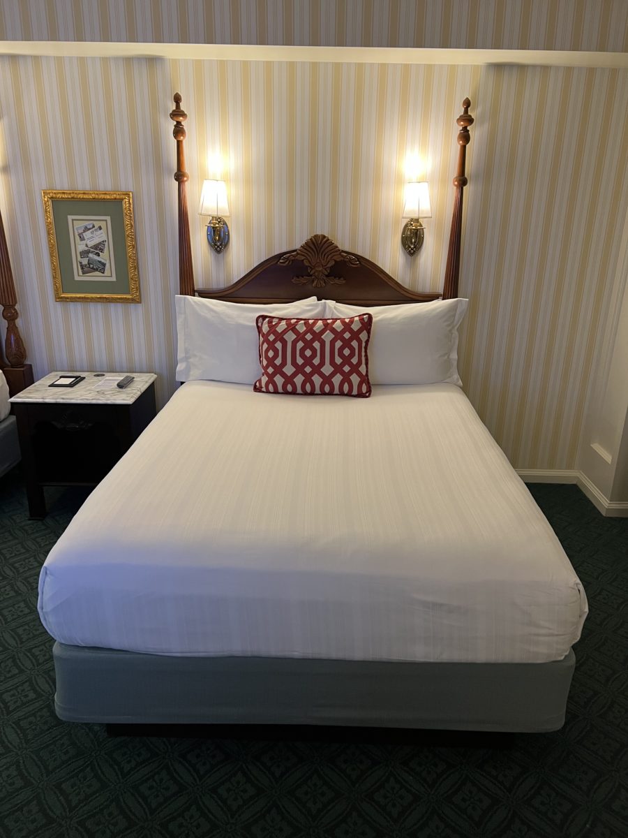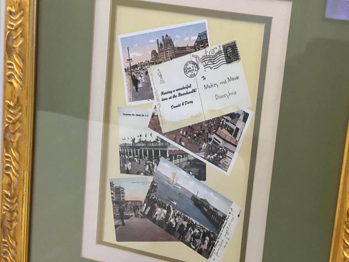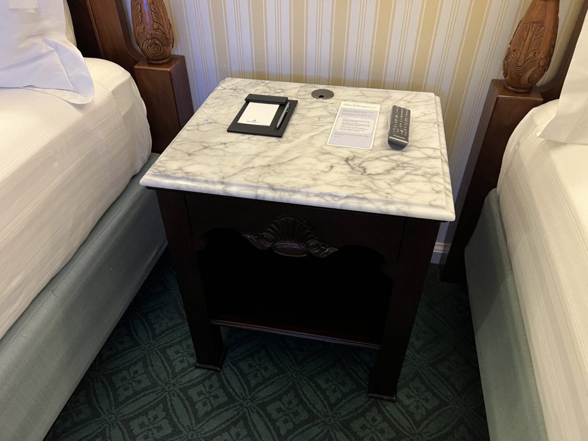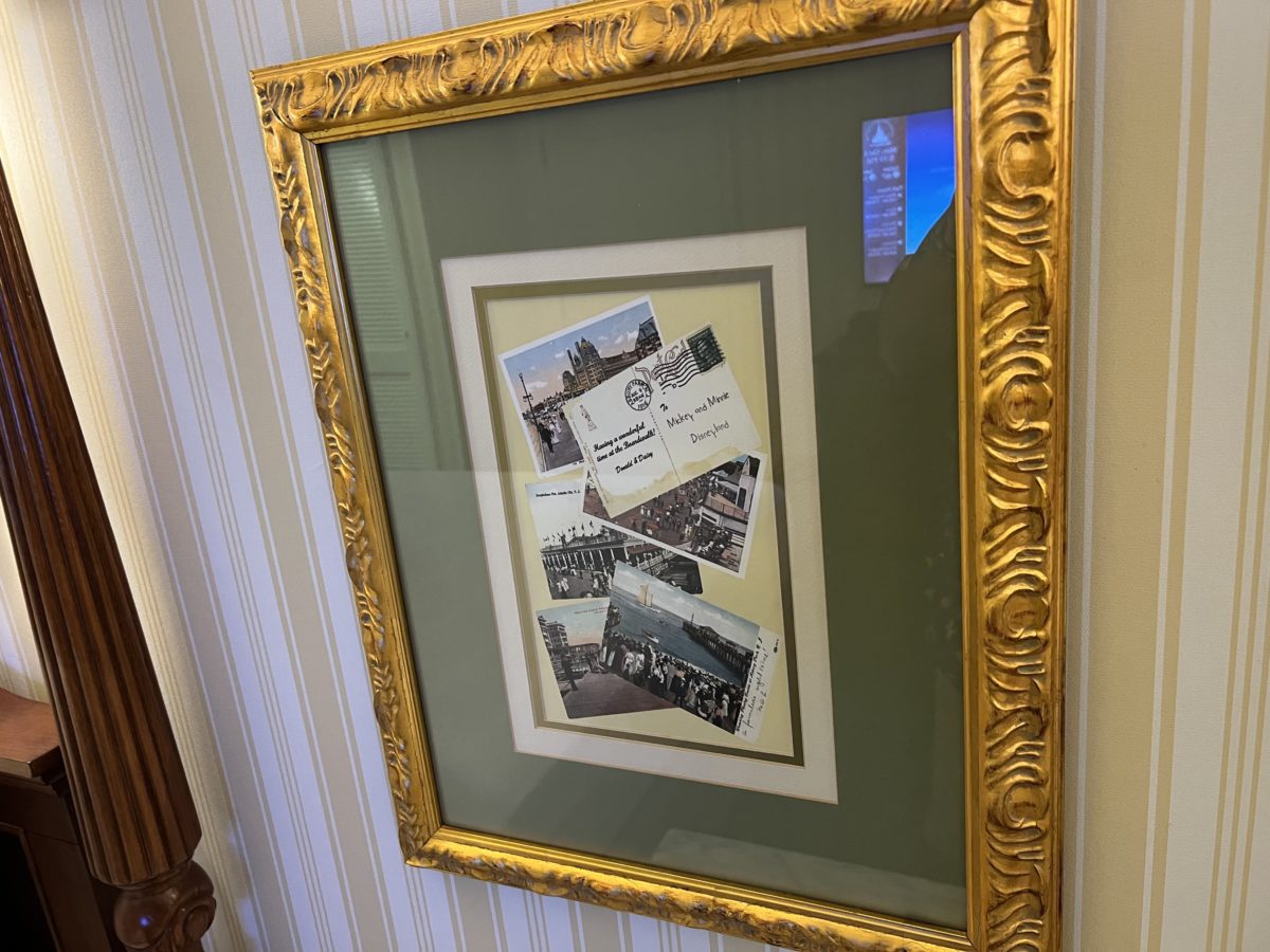 In between the beds is a nightstand and a frame with some postcards, including one from Donald and Daisy!