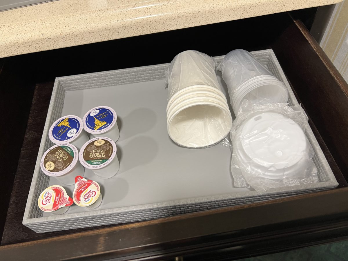 In the drawer is additional coffee, creamer, and cups.
