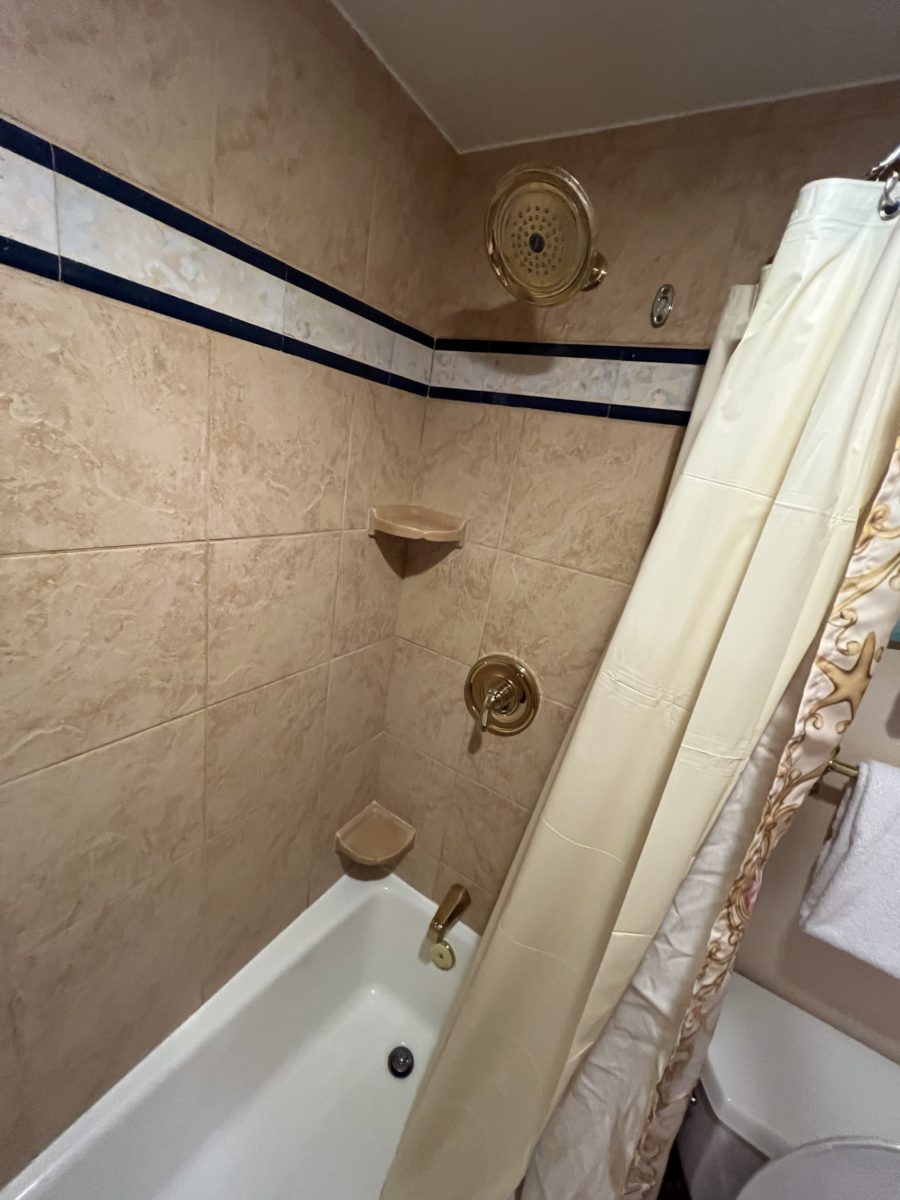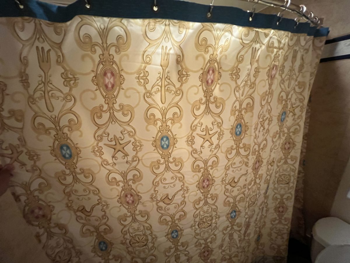 The shower curtain is a beige color with gold patterns. It also features blue and red oval shapes, as well as some of Ariel’s things.