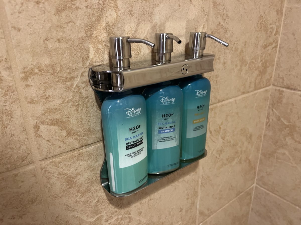 Bottles of Disney Resorts body wash, shampoo, and conditioner are provided. These bottles can’t be removed or opened. The body wash is Sea Salt scented. The shampoo and conditioner are Sea Marine.