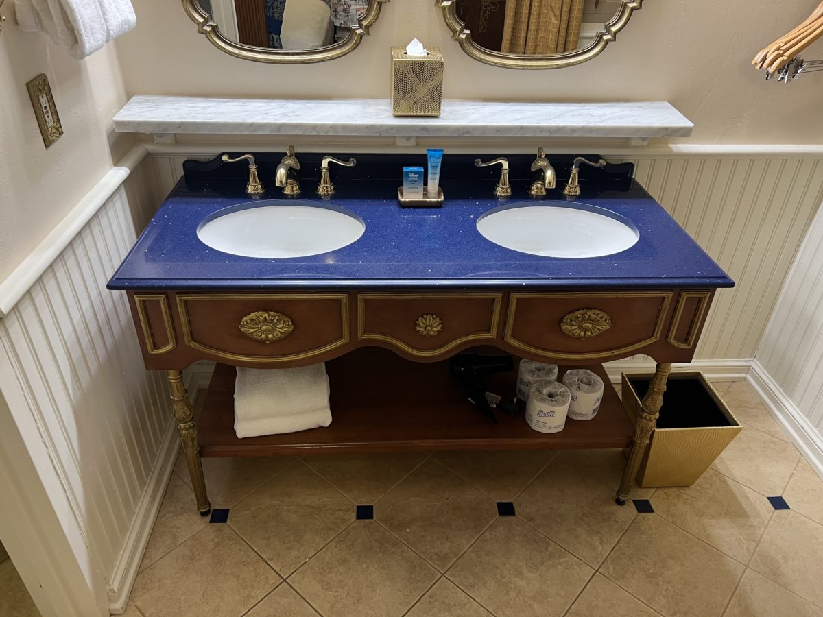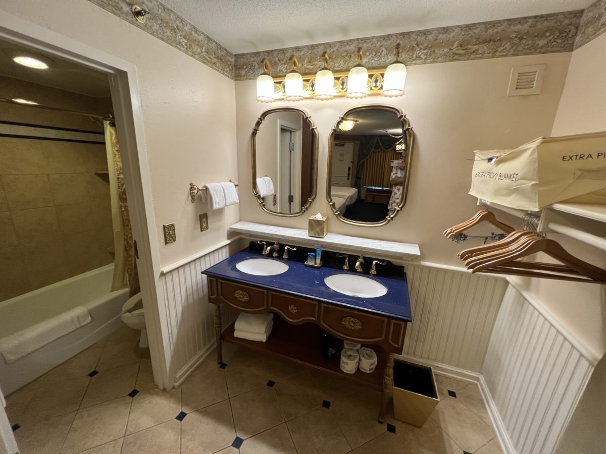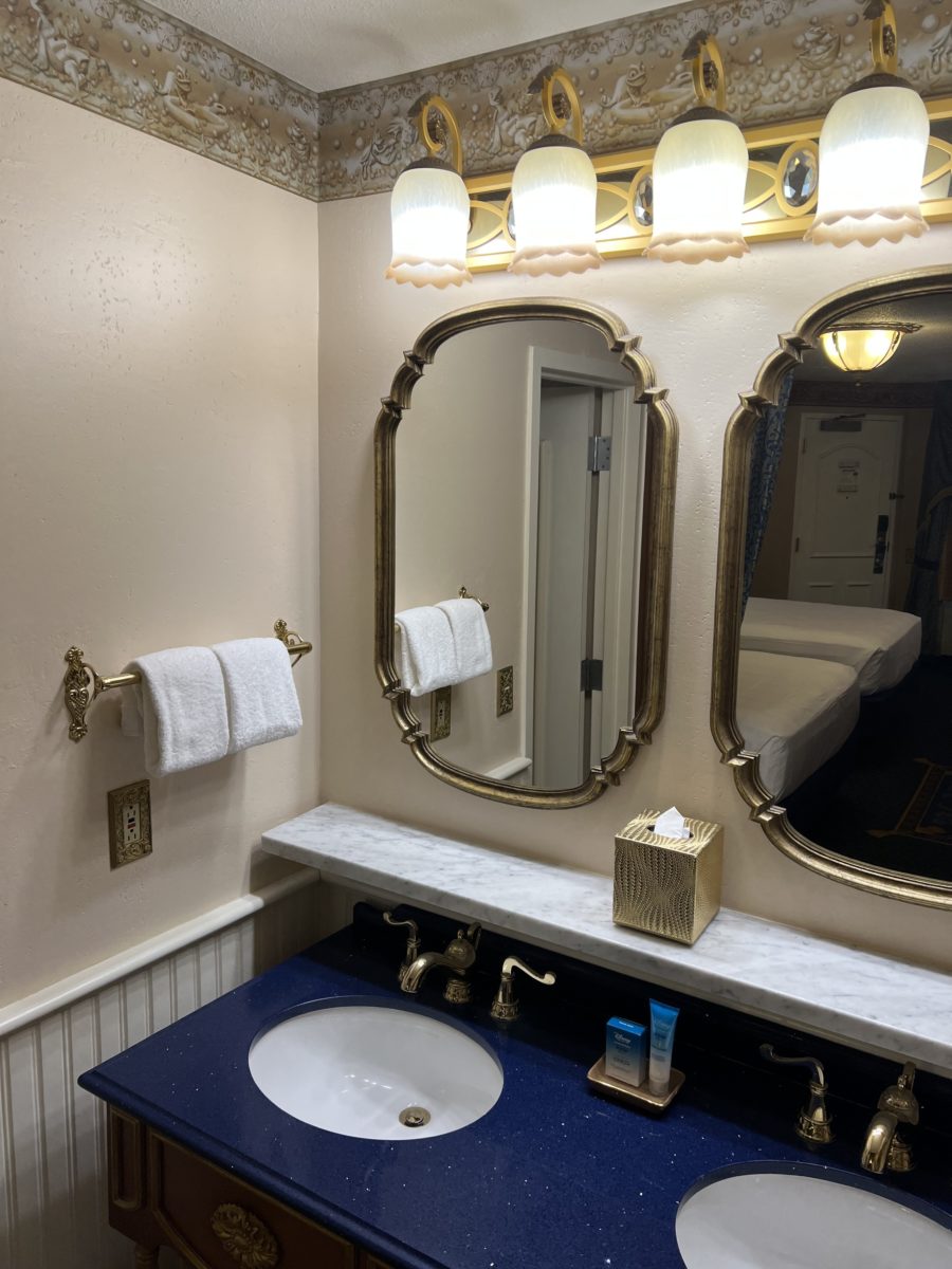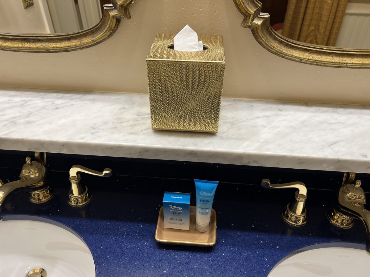 A gold tissue box sits on the shelf above the sinks. Below that sits a small tray with the Disney Resorts soap and lotion.