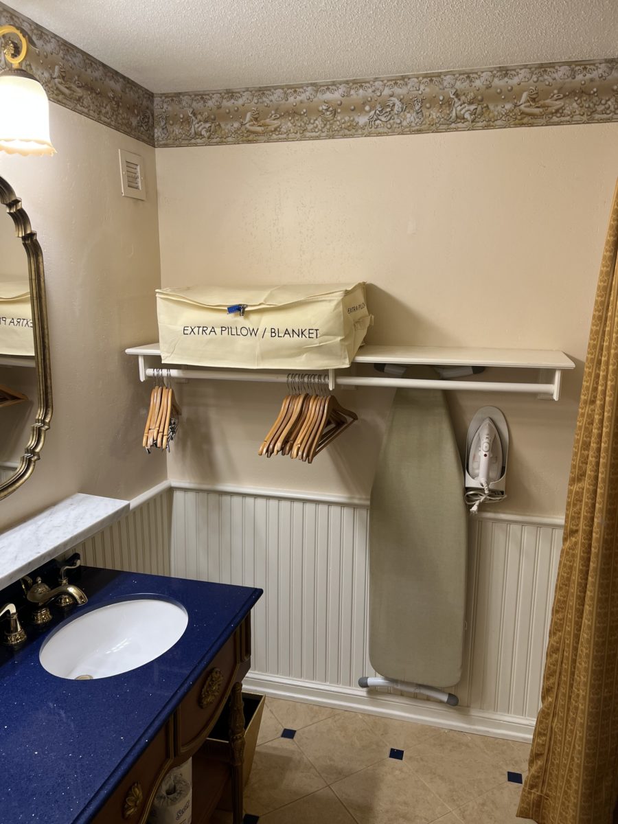 Guests will find a shelf and hanging rod to store clothes. Several hangers are provided. There is an extra blanket and pillow, as well as an iron and ironing board.