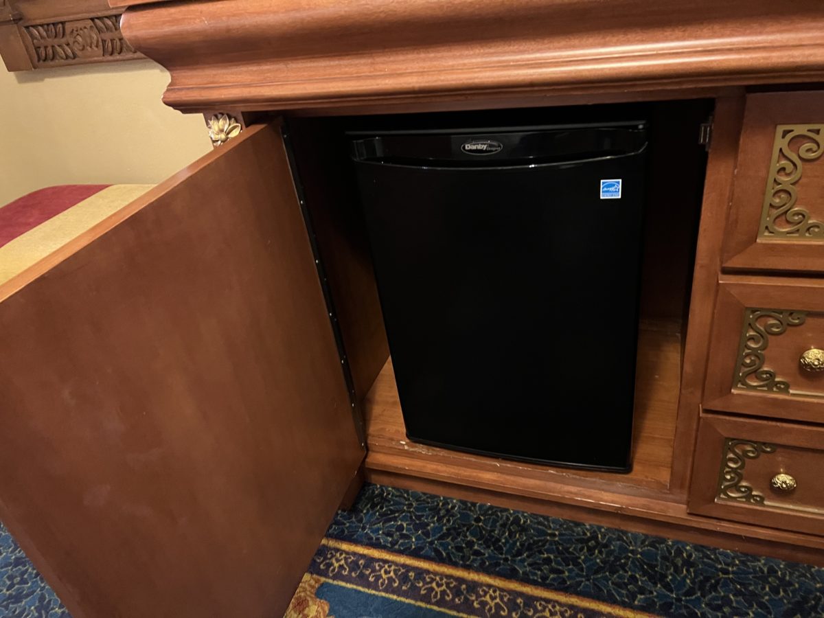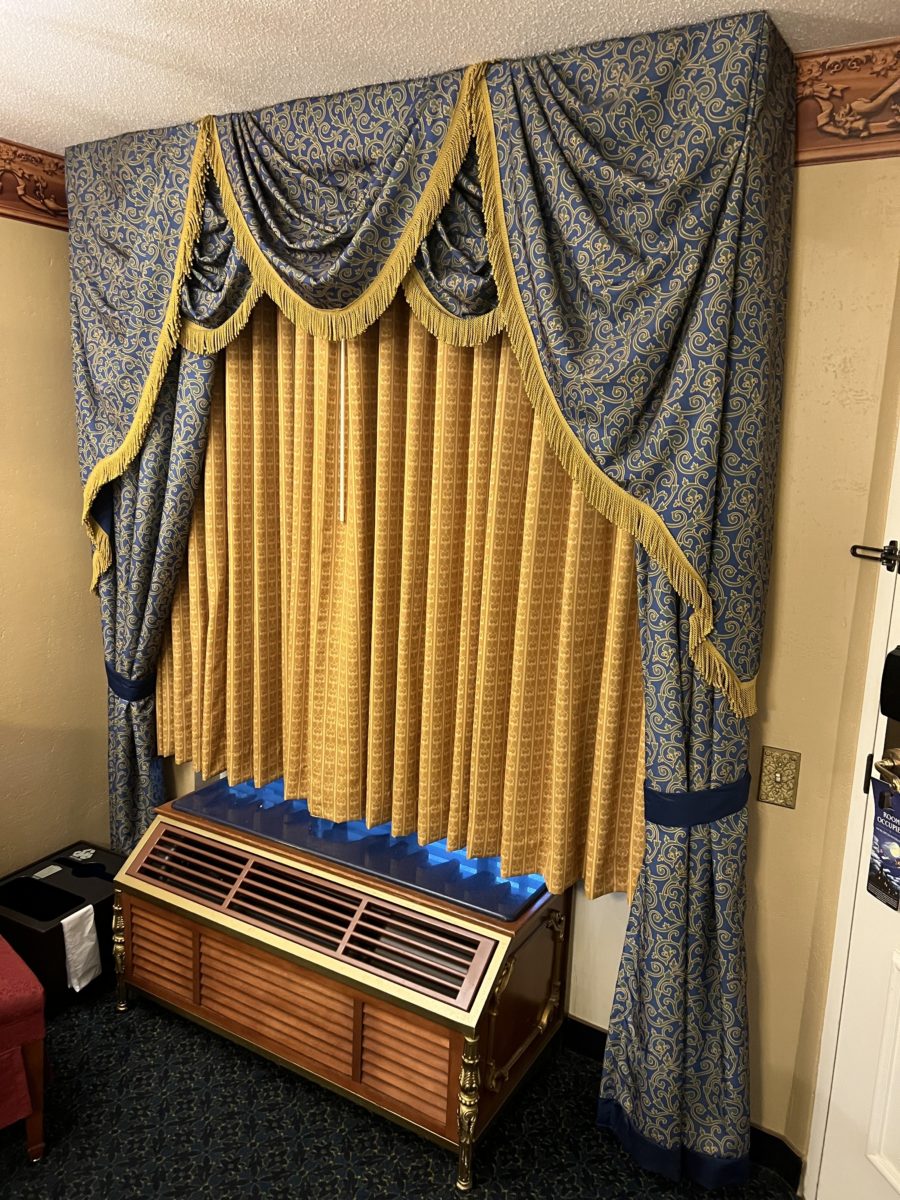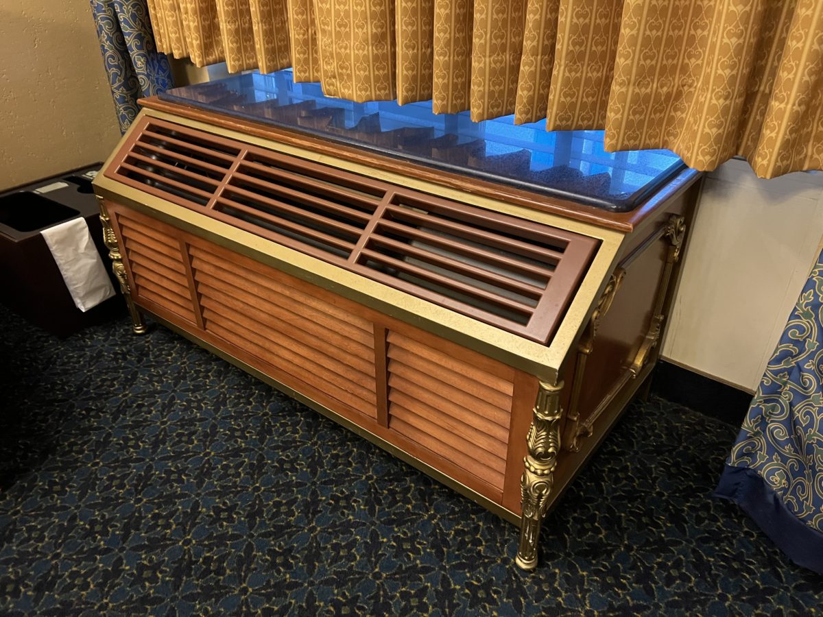 Below the window is the room’s air conditioner. It has a wood exterior cover with ornate gold trim.