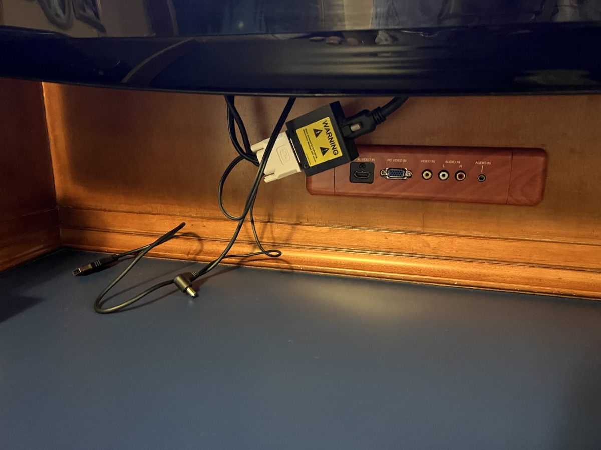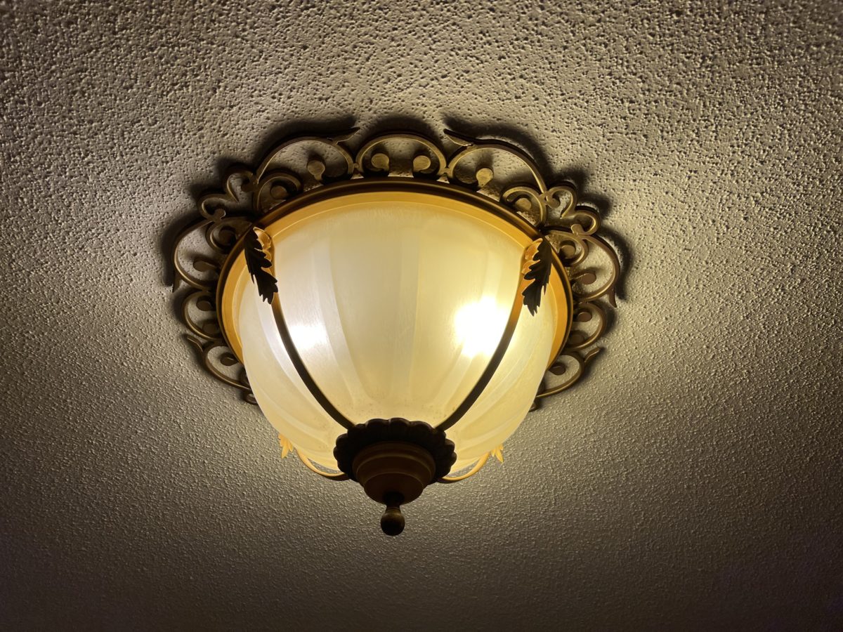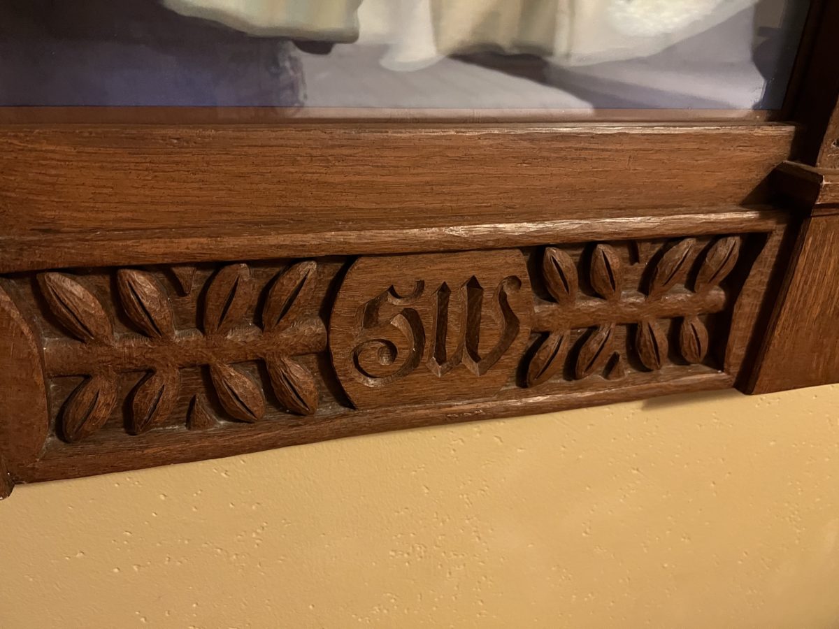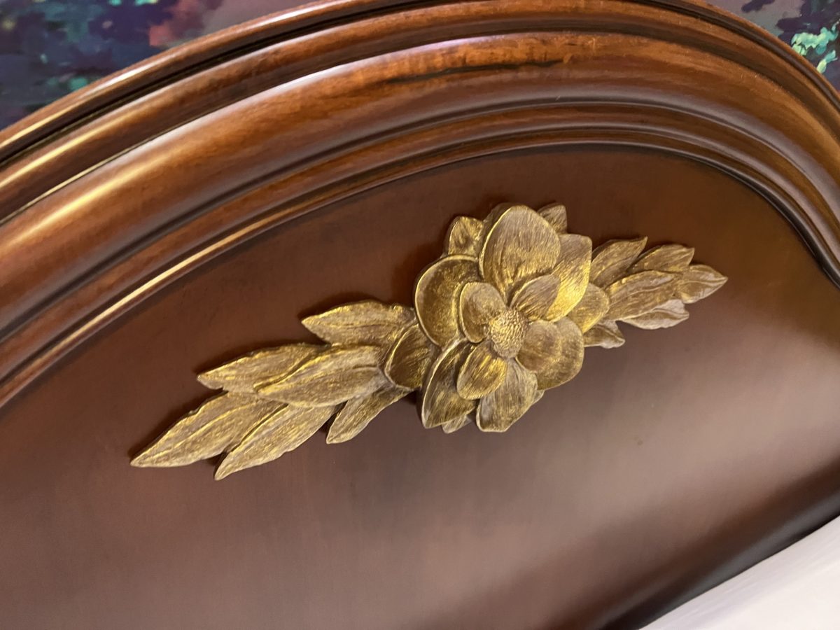Below the window is the room’s air conditioner. It has a wood exterior cover with ornate gold trim.